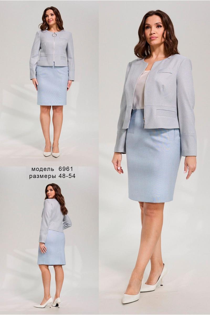 Костюм женский полуприлегающего силуэта состоит из жакета и юбки, выполнен из костюмной ткани различной по дизайну. Жакет укороченный, по переду подрез, клапаны, талевые вытачки и застёжка тесьма молния. Спинка с подрезом и талевыми вытачками. Горловина круглая. Рукава двух шовные втачные на манжете. Жакет на полуподкладке. Юбка, зауженная к низу, с цельнокроеным поясом. По переду прорезные карманы с листочкой. Застёжка потайная тесьма молния в центральном шве спинки, который заканчивается шлицей с разрезом. Юбка на трикотажной подкладке.
