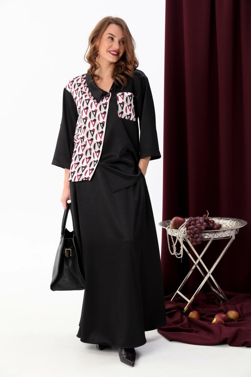 Костюм комбинированный двухпредметный: состоит из жакета и юбки. Жакет рубашечного типа прямого силуэта с асимметричным низом. Рукав втачной со спущенной линией плеча, фиксируется на пату. Застежка центральная на петли и пуговицы, смещённая по косой. На левой полочке накладной карман с клапаном. Воротник отложной на стойке до половины спинки. Юбка - солнце макси с узким поясом. В боковых швах расположены карманы. Застёжка на петлю и пуговицу и молнию по спинке.