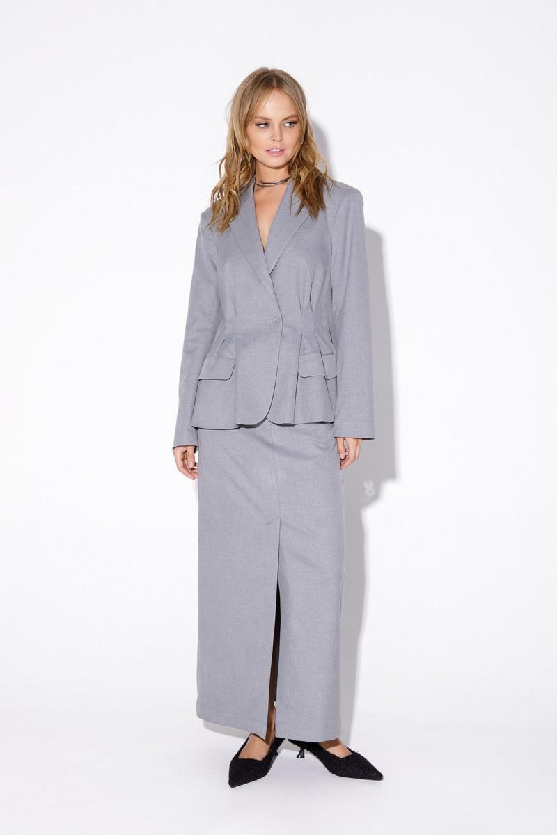 Текстильный костюм-двойка из укороченного приталенного жакета со складками и прямой макси-юбки с высоким разрезом. Детали: пиджачный воротник, перед с функциональными карманами, застежка на одну петлю и пуговицу, рукава втачные двухшовные, спинка с рельефами и резинкой по талии. Жакет на подкладке. Юбка на притачном поясе со шлевками, талиевые вытачки, боковые карманы, застежка на потайную молнию, на подкладке. Длина жакета по спинке около 64 см в размерах 40-46 и около 67 см в размерах 48-52, длина рукава около 61 см. Длина юбки по боковому шву с поясом около 95 см в размерах 40-52 см