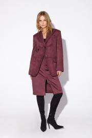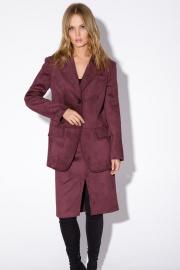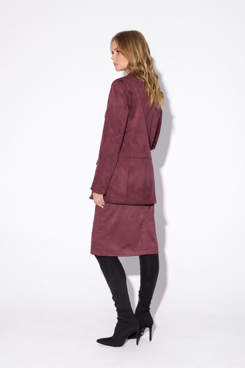 Костюм-двойка из свободного жакета и юбки «карандаш» с высоким разрезом из плотного трикотажа под замшу.