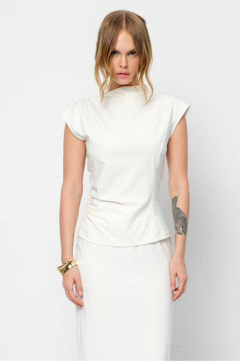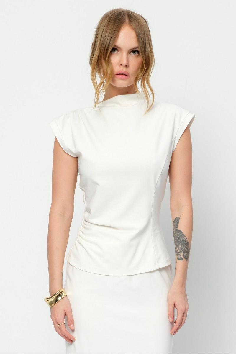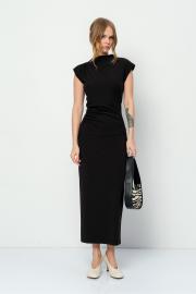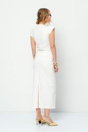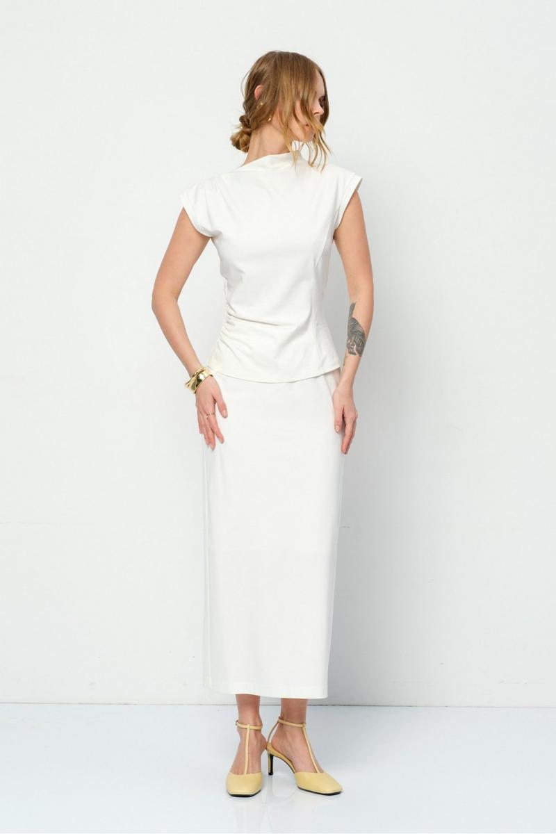 Трикотажный костюм-двойка из облегающей асимметричной блузы и миди-юбки. Детали: прилегающий силуэт, асимметричный крой, фигурный вырез горловины переда и спинки, без застежки. Юбка прямого силуэта, пояс на резинке, спинка с высоким разрезом. Юбка на трикотажной подкладке. Длина блузы по спинке со стойкой около 58 см в размерах 40-46 и около 61 см в размерах 48-52. Длина юбки по боку с поясом около 88 см