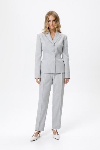 Костюм-двойка из приталенного жакета с акцентными плечами и асимметричной юбки со складками.