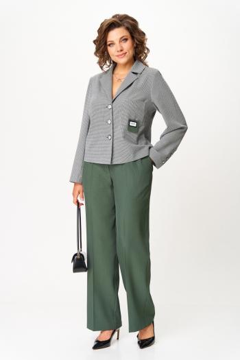 Детали: жакет прямого силуэта, расширенная линия плеч, пиджачный воротник, перед с функциональными карманами, однобортная застежка на петли и пуговицы, спинка со средним швом и шлицей, рукава втачные двухшовные, жакет на подкладке. Юбка на притачном поясе, застежка сзади на потайную молнию, юбка на подкладке.