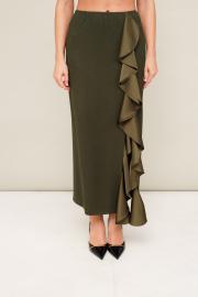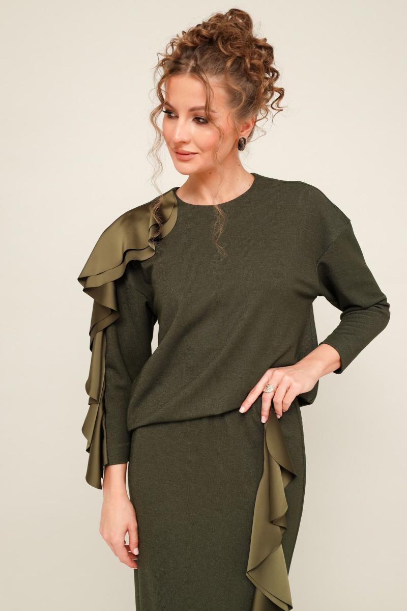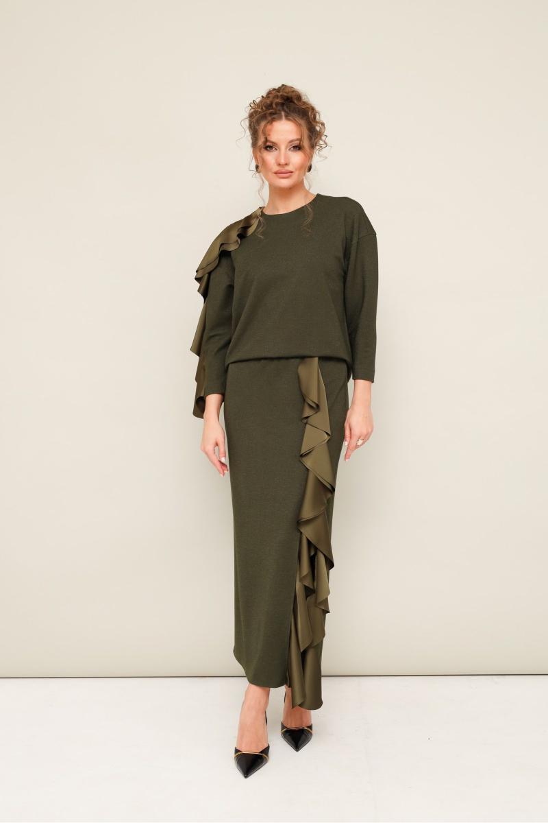 Элегантный трикотажный комплект, состоящий из джемпера и юбки. Джемпер прямого силуэта со спущенной линией втачивания плеча, рукава в длине 7/8. По спинке разрез с застежкой на пуговицу и навесную петлю. Юбка в длине миди с притачным поясом на резинке. Спереди обработан высокий разрез. Комплект декорирован двойным сатиновым воланом по плечевому шву, рукаву и по вертикальному подрезу в юбке.