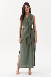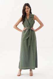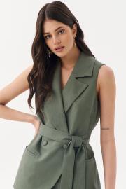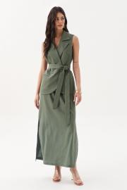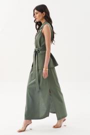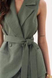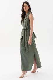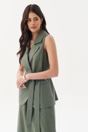 Костюм: жилет+юбка. Жилет двубортный полуприлегающего силуэта: •воротник пиджачного типа с лацканами •прорезные карманы с листочками •застежка на пуговицы •на подкладке •съемный пояс Юбка прямого силуэта: •широкий притачной пояс на резинке •в боковых швах карманы •по бокам высокие разрезы