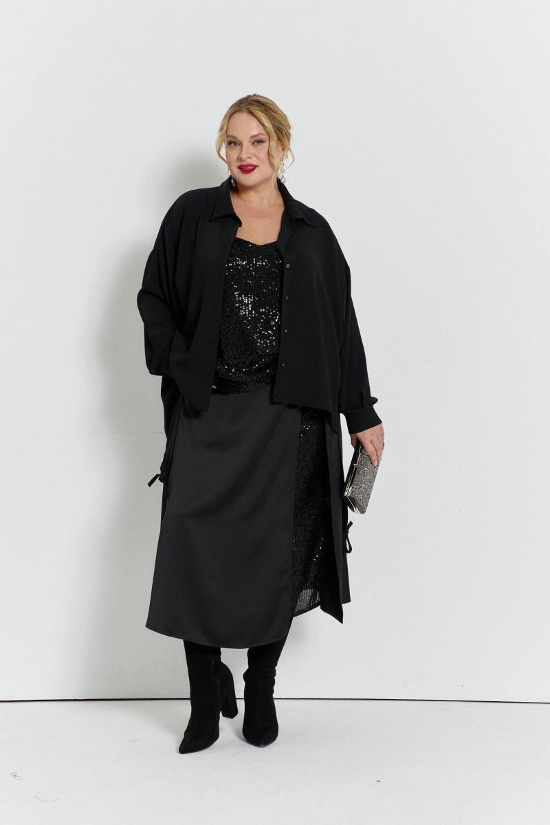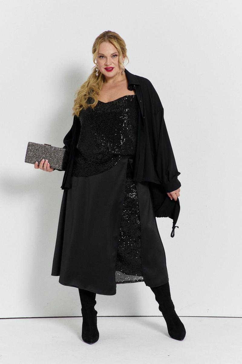 Жакет свободный, с мягкой линией плеча, воротником пиджачного типа с отворотами лацканов и с кокетками на спинке и спереди. В боковых швах обработаны карманы. Изделие на подкладке Длина по спинке ок. 76 см, длина рукава от нормали ок. 64 см. Топ из ажурной ткани на подкладке. Спереди нагрудные вытачки. Бретели регулируются по длине. Длина спинки от основания шеи ок. 66см. Юбка с расширением к низу, на поясе с резинкой и застёжкой на молнию сбоку. На переднем полотнище разрез от пояса, открывающий подкладку из нарядной декоративной ткани. Изделие на подкладке. Длина сбоку с поясом ок. 90 см.
