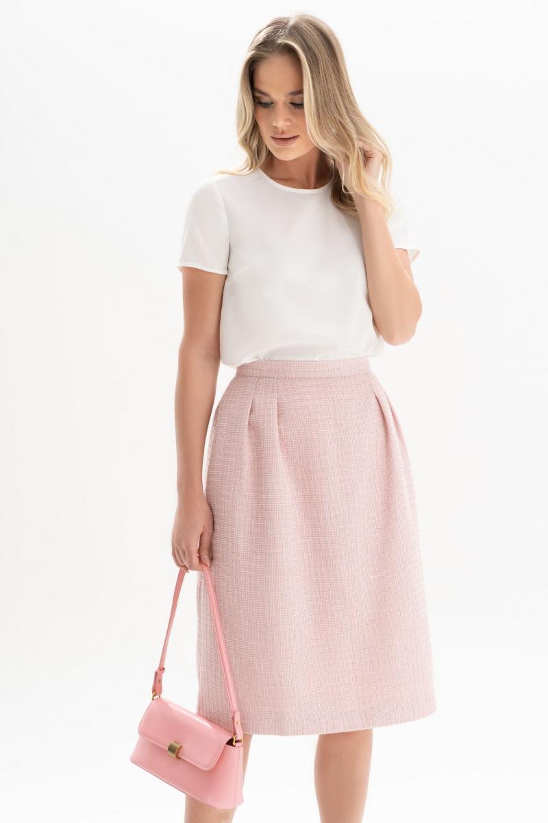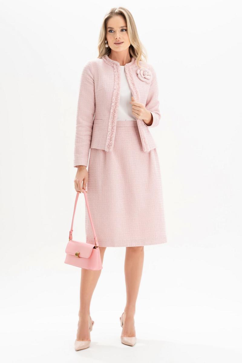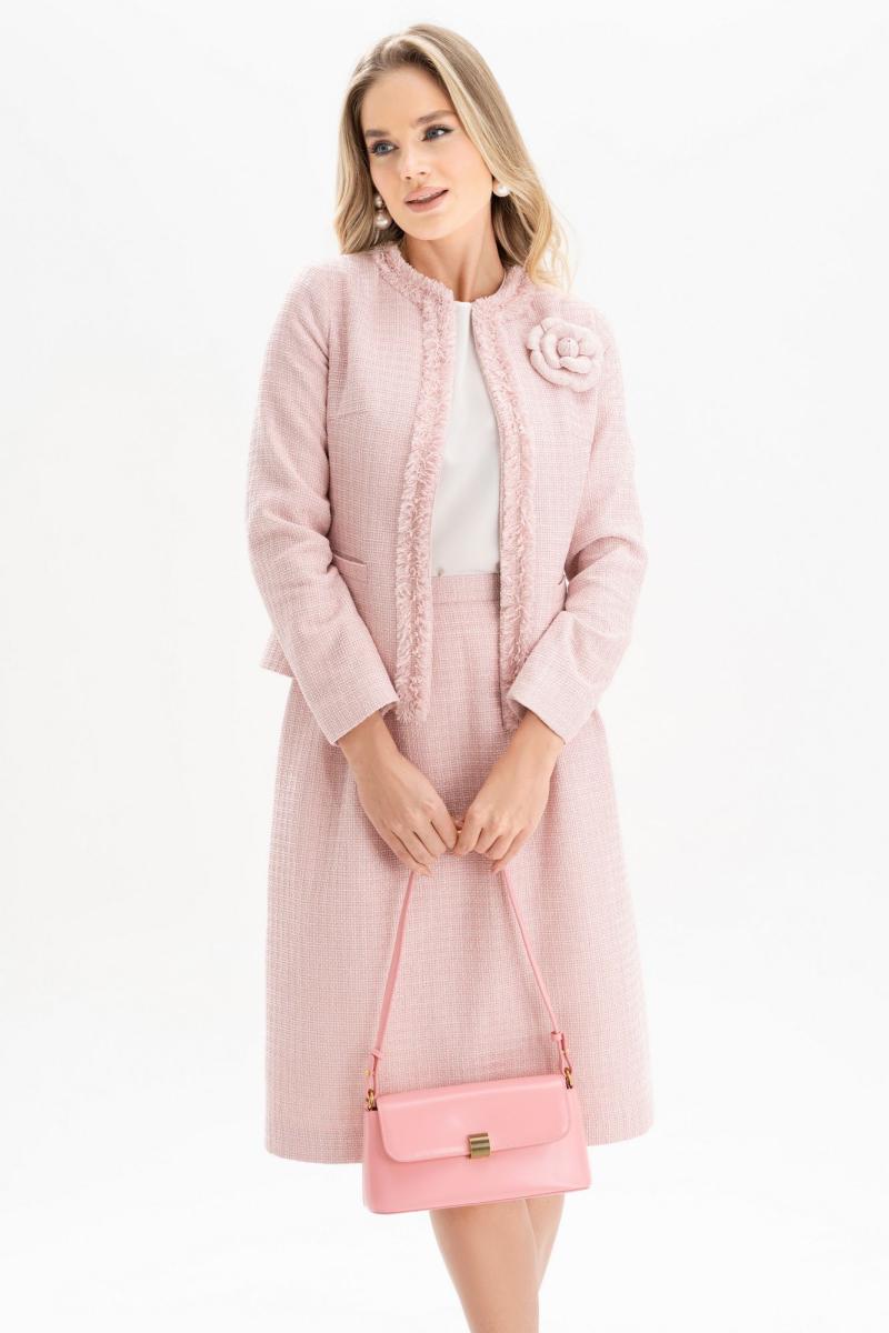 Стильный женский твидовый костюм с юбкой в нежно-пудровом цвете со съёмным цветком ручной работы. Этот элегантный и модный комплект станет вашим незаменимым помощником в создании неповторимых и запоминающихся образов. Костюм женский 2-х предметный, состоящий из жакета и юбки, выполненных из костюмной ткани ""рогожка"". Костюм может быть как нарядный, так и для повседневной носки.