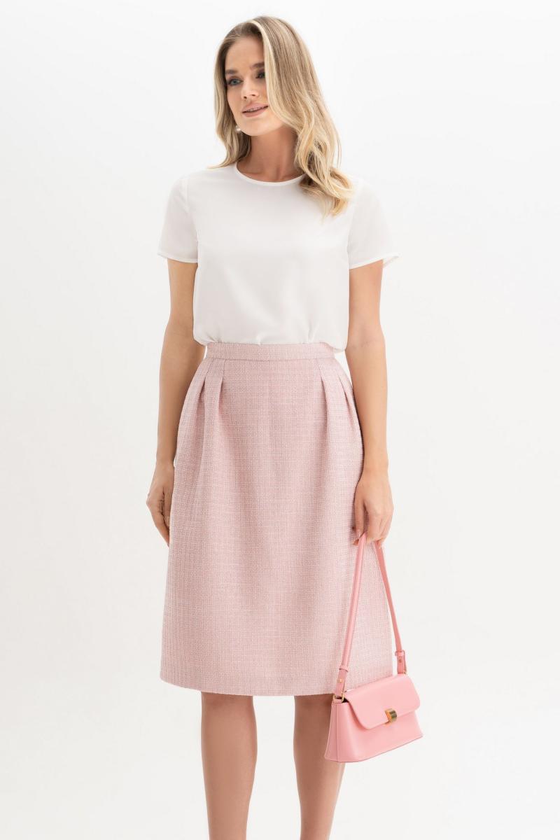 Юбка на притачной по низу подкладке, с притачном поясом, застегивающимся на 1 петлю и 1 пуговицу. Переднее полотнище с двумя парами односторонних складок, застроченных от пояса вниз на 3,0 см. Заднее полотнище с двумя парами талиевых вытачек и средним швом, в верхней части которого обработана застежка на потайную тесьму-молнию. В 50,52,54,56 размерах в поясе предусмотрена резинка для лучшего прилегания по талии. Состав ткани