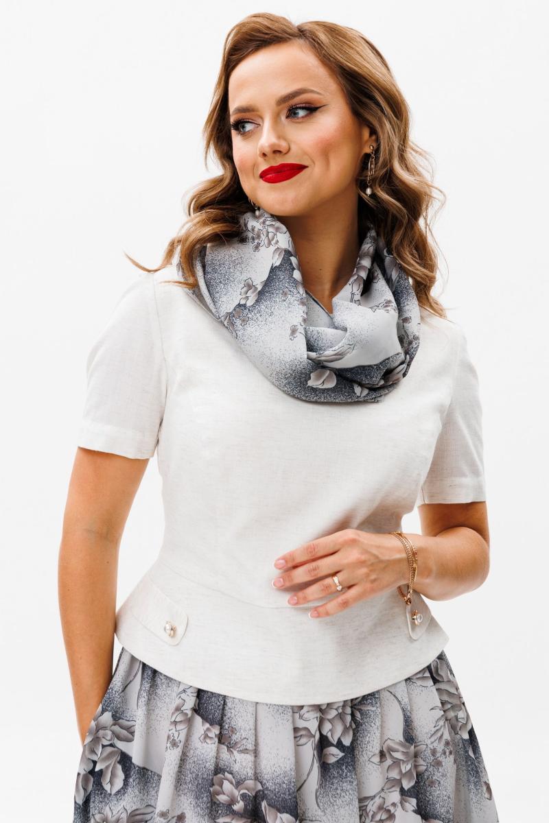 Стильная блуза в сочетании с юбкой создают элегантный и женственный образ. Комплект женский 2-х предметный, состоящий из блузки, выполненной из костюмно-плательной ткани, юбки и съемного шарфа из плательной ткани.