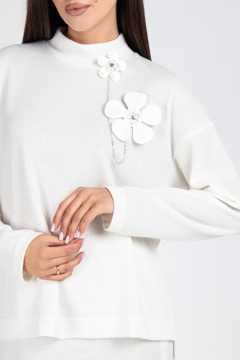 Костюм женский, состоящий из джемпера и юбки.  Джемпер прямого силуэта со спущенным плечом. Перед и спинка цельные. Горловина с притачной стойкой. Отделочным элементом джемпера является украшение - цветы. Юбка прямого силуэта, на подкладке. В боковых швах юбки имеются разрезы. Уход: бережная стирка при температуре не выше 30°С.