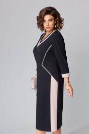 Платье полуприлегающего силуэта с V- образным вырезом горловины, без подкладки. По переду декоративные вставки из отделочной ткани. Спинка со средним швом. Рукав втачной одношовный с манжетой по низу. Длина платья 113 см, длина рукава 50 см.