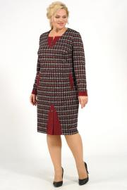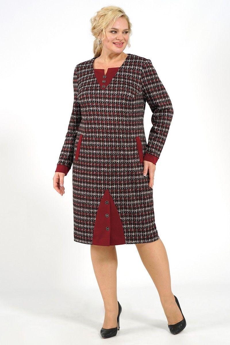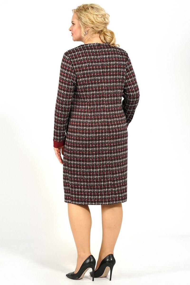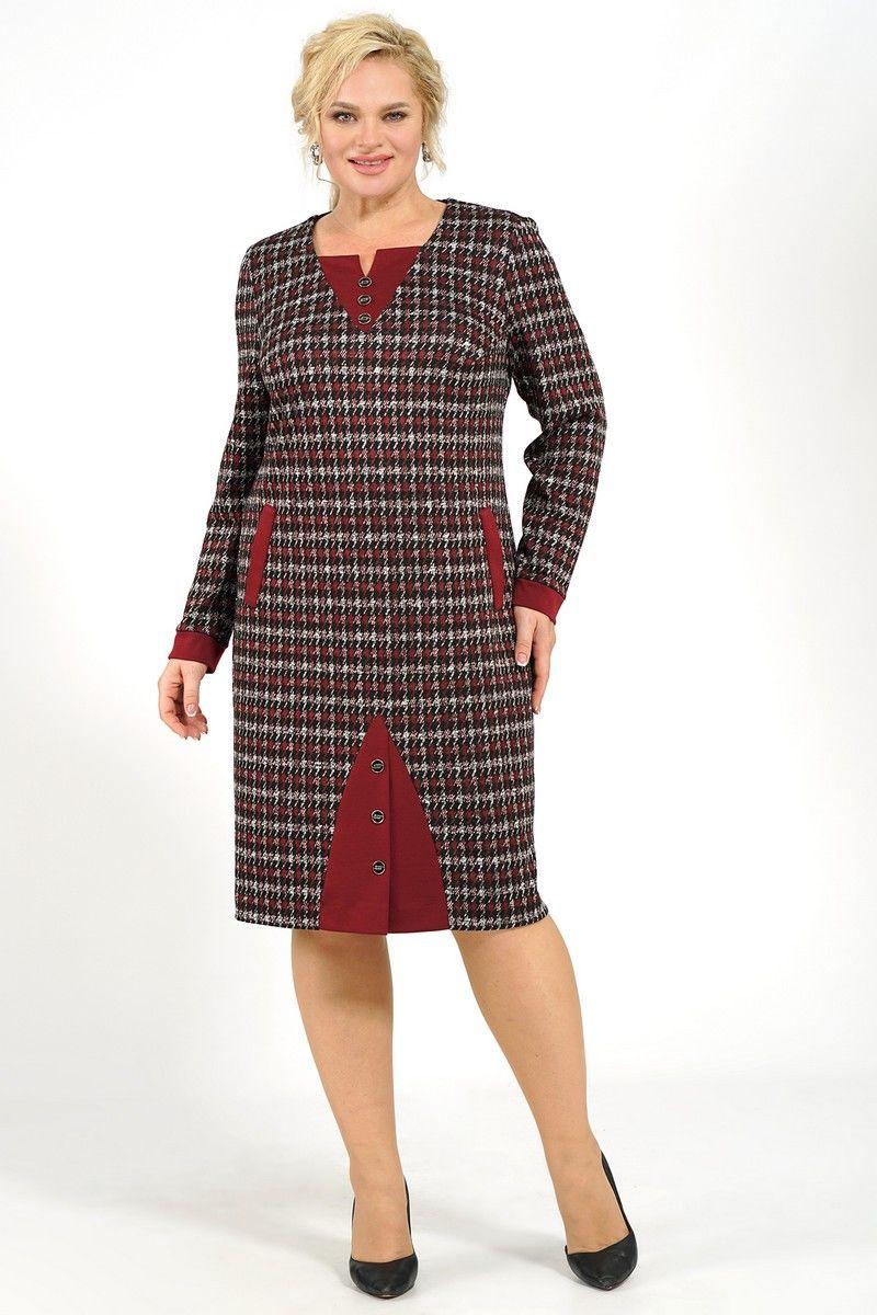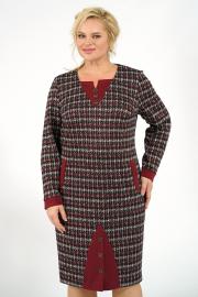 Платье женское полуприлегающего силуэта, с застёжкой на потайную тесьму-молнию по спинке. Перед с нагрудными выточками, с имитацией карманов с листочкой с настрочными концами, понизу конструктивный V- образным подрез с отделочной деталью со шлицей декорированная тремя пришивными пуговицами. Рукава втачные, одношовные, длинные, понизу с притачными манжетами. Горловина с вырезом V- образной формы и отделочной деталью по центру с разрезом и тремя пришивными пуговицами. Отделочная деталь горловины и низа переда, листочка кармана, манжета рукава выполнены из однотонного трикотажа