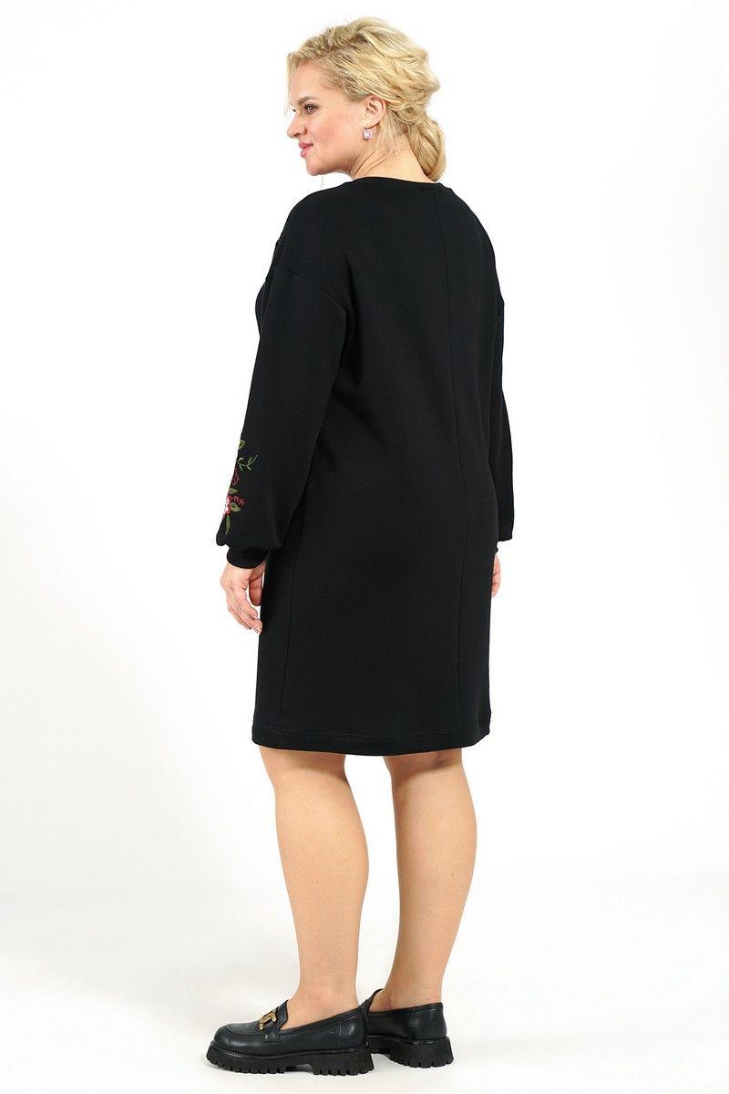 Платье женское прямого силуэта, со спученной линией плеча, рукава понизу декорированы вышивкой. Перед с притачными каскетками в шве соединения с отделочной тесьмой «кружево». Горловина с втачной бейкой. Рукава длинные, одношовные, понизу с притачными манжетами. Бейка горловины, манжеты рукава выполнены из отделочной ткани «довяз».