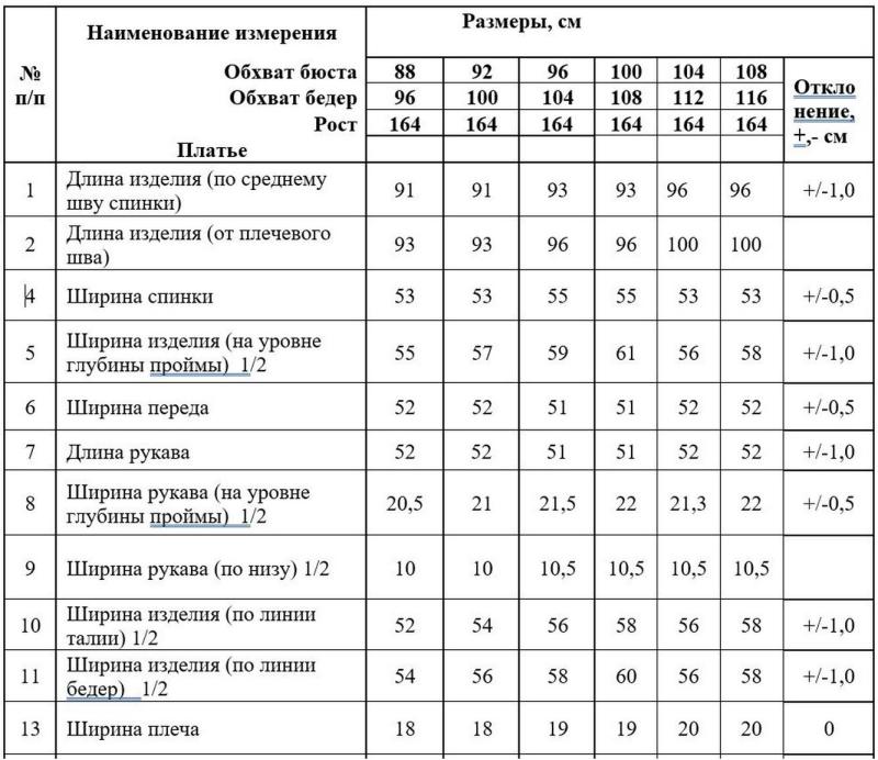 Таблица размеров