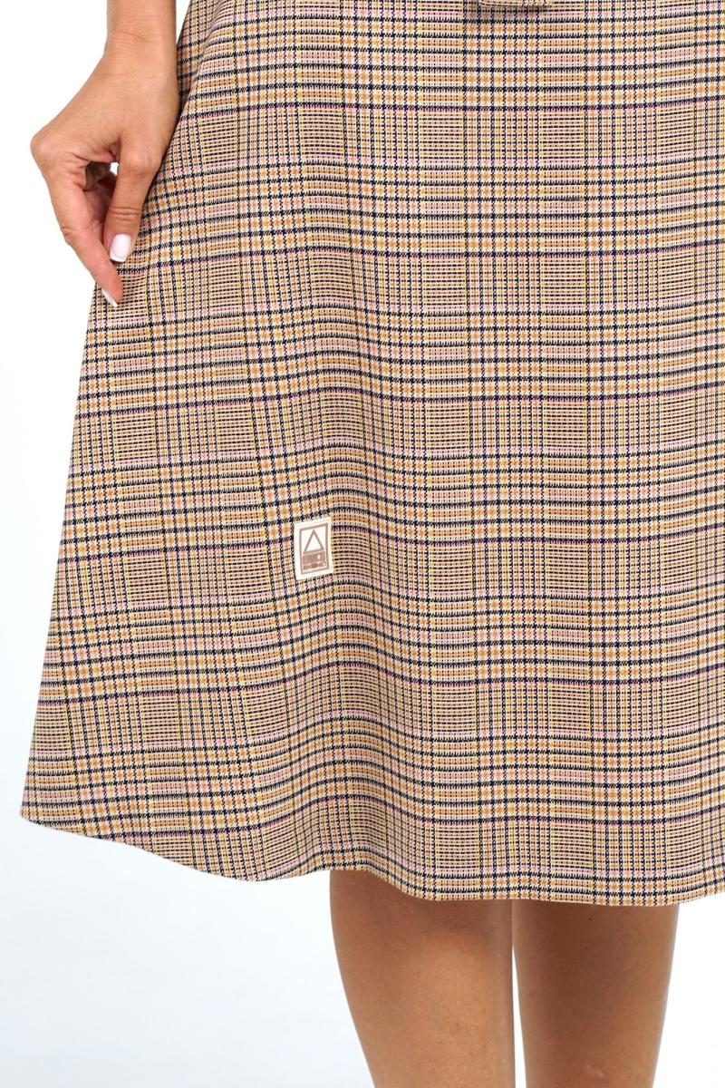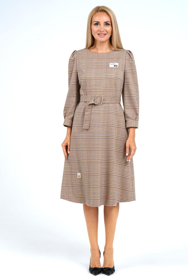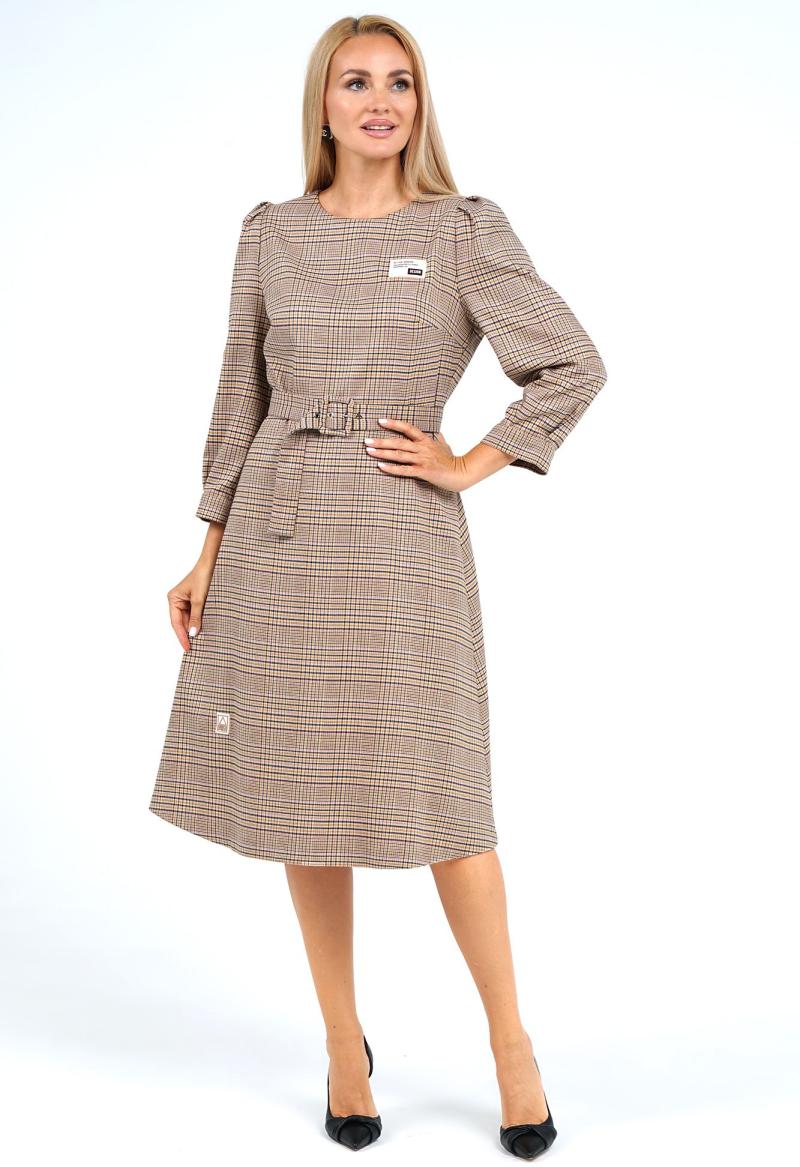 Платье полуприлегающего силуэта верху расширенное книзу, отрезное по линии талии, с застёжкой на потайную тесьму-молнию в среднем шве спинки, с завязывающимся поясом. Перед с нагрудными выточками. Спинка по верхней части с талевыми выточками. Рукава втачные, одношовные, длиной ¾, по окату и низу с мягкими складками с притачными манжетами. Декорировано нашивками по верхней и нижней части переда.