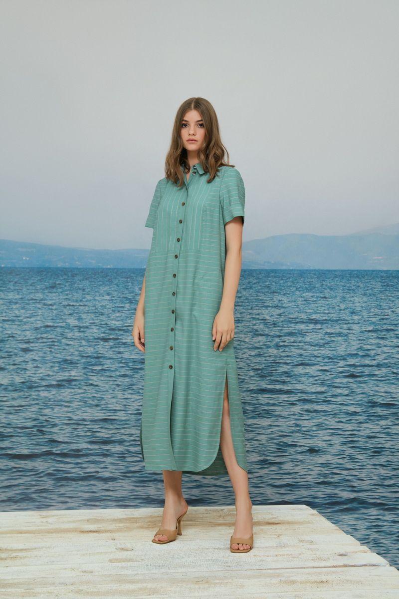 Платье из плательной ткани, прямого силуэта, застежка по переду на планку, планка застегивается на двенадцать петель и пуговиц. Перед с отрезной кокеткой, фигурной формы, по центру переда притачная планка. Спинка с отрезной кокеткой, встречной складкой. Рукава втачные, одношовные, короткие, с цельнокроеными манжетами. Воротник отложной с отрезной стойкой, с застежкой на петлю и пуговицу. Платье с карманами в боковых швах.