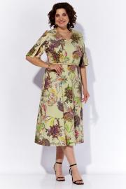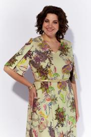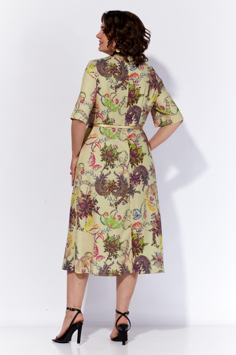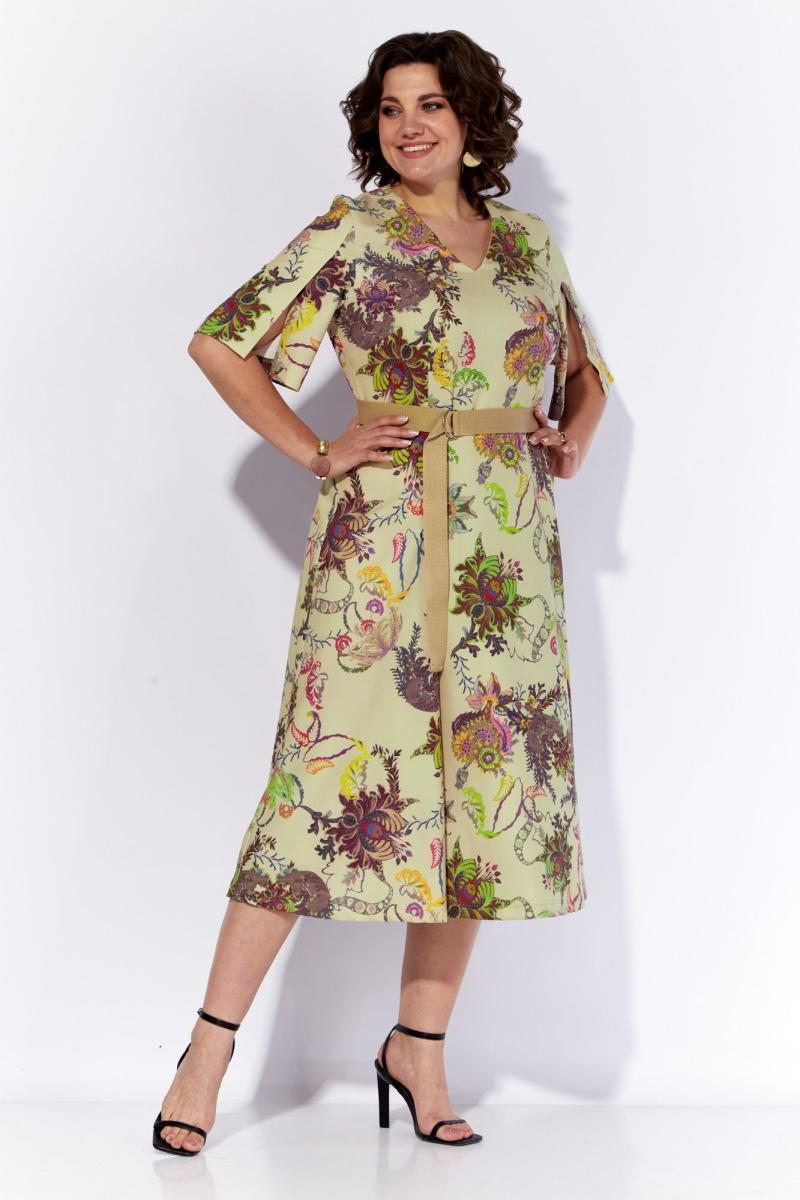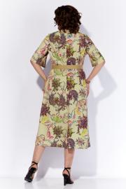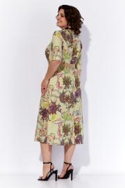 Платье полуприлегающего силуэта. Ткань смесовая с нанесенным принтом «горох». Отрезное по линии талии. Горловина с V-образным вырезом. Рукава втачные с декоративными разрезами. По среднему шву спинки и юбки потайная застежка «молния». Перед лифом с нагрудными и талиевыми вытачками. По переднему полотну юбки выполнена декоративная складка. Лиф платья на подкладке. Длина изделия-118 см, Длина рукава- 32,5 см.