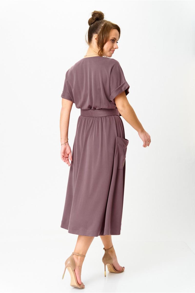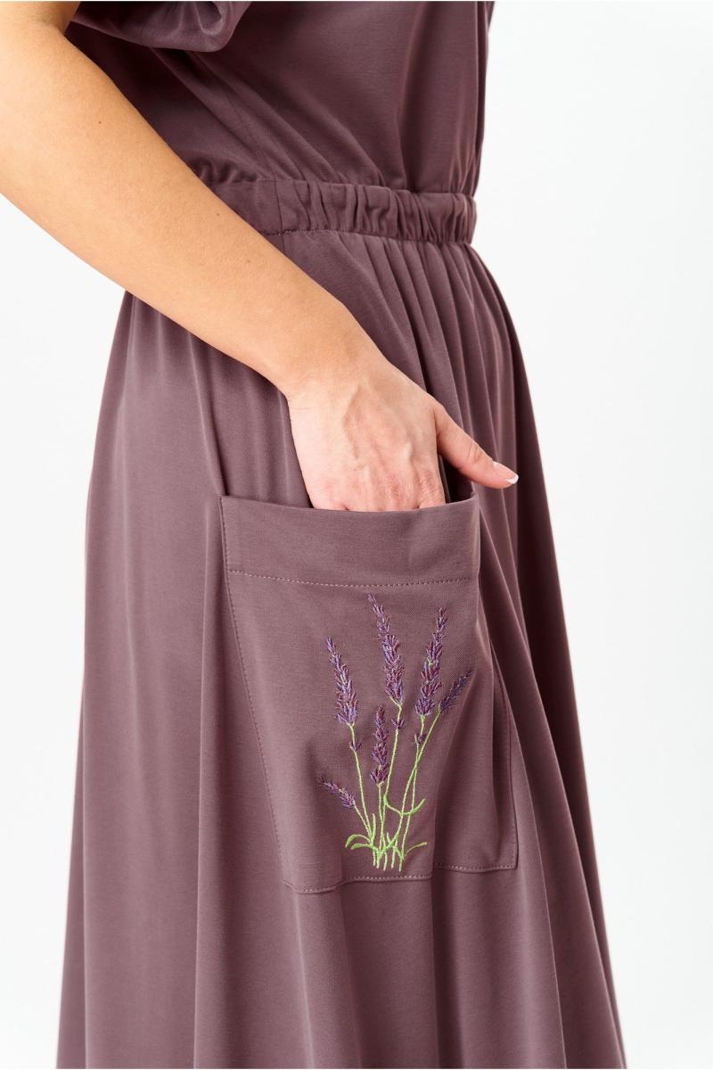 Платье женское из смешанной ткани, для повседневной носки и торжественных выходов. Платье, расширенное к низу и отрезное по талии. Перед лифа с запахом и V- образным вырезом. Рукава цельнокроеные, заканчивающиеся на манжету. По линии талии (отреза) кулиса с эластичной тесьмой. Юбка длинной до середины икры, по боковым обработанные накладные карманы, смещенные к центру переда. На правом кармане вышивка «Лаванда»