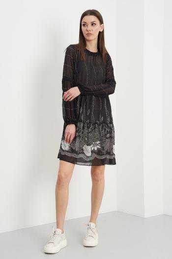 Платье полуприлегающего силуэта выполнено из ткани с цветочным принтом. Характеристики: полуприлегающий силуэт, отрезное, отрез на резинке на кулиске, V образный вырез горловины, по переду имитация застежки на петли пуговицы, пуговицы декорированы тканью основного изделия, рукав втачной, по низу рукава резинка. Длина по спинке 90 см, длина рукава 63 см.