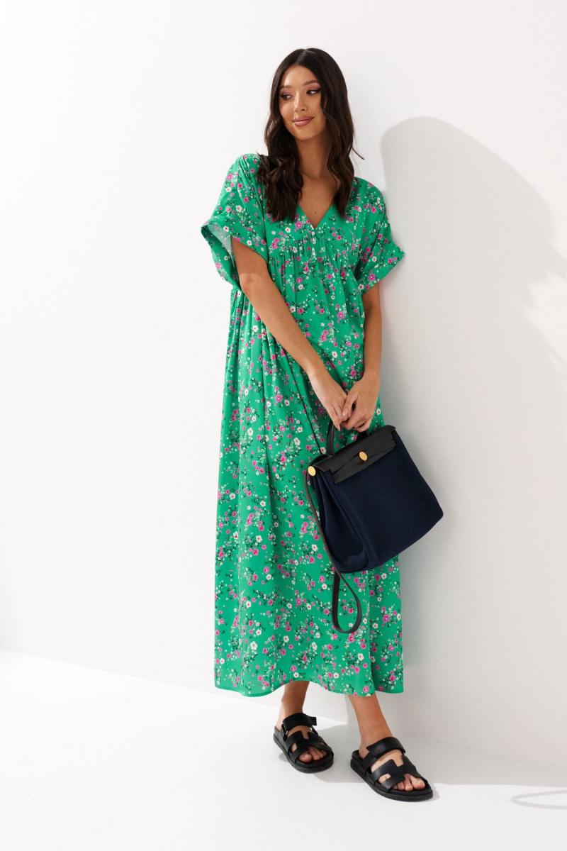 Платье свободного кроя выполнено из зеленого полотна с ярким цветочным принтом. Характеристики: свободный крой, подкладка, отрезное, V-образный вырез горловины, цельнокроеный рукав, по низу рукава подгиб. Длина по спинке 126 см.