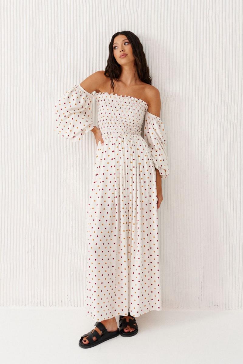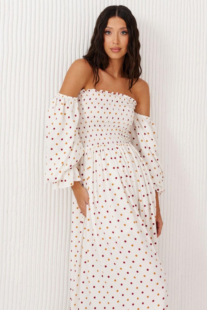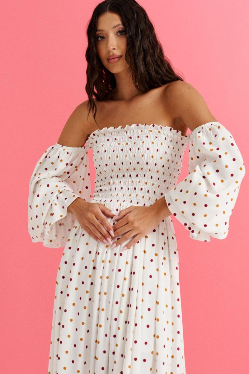 Платье с открытыми плечами выполнено из белого полотна с принтом горох. Характеристики: полуприлегающий силуэт, открытые плечи, отрезное, верх изделия выполнен венгеркой, во верхней части рукава резинка, низ в изделии на подкладке свободного кроя. Длина по спинке 125 см.