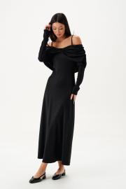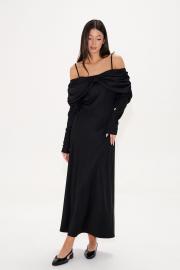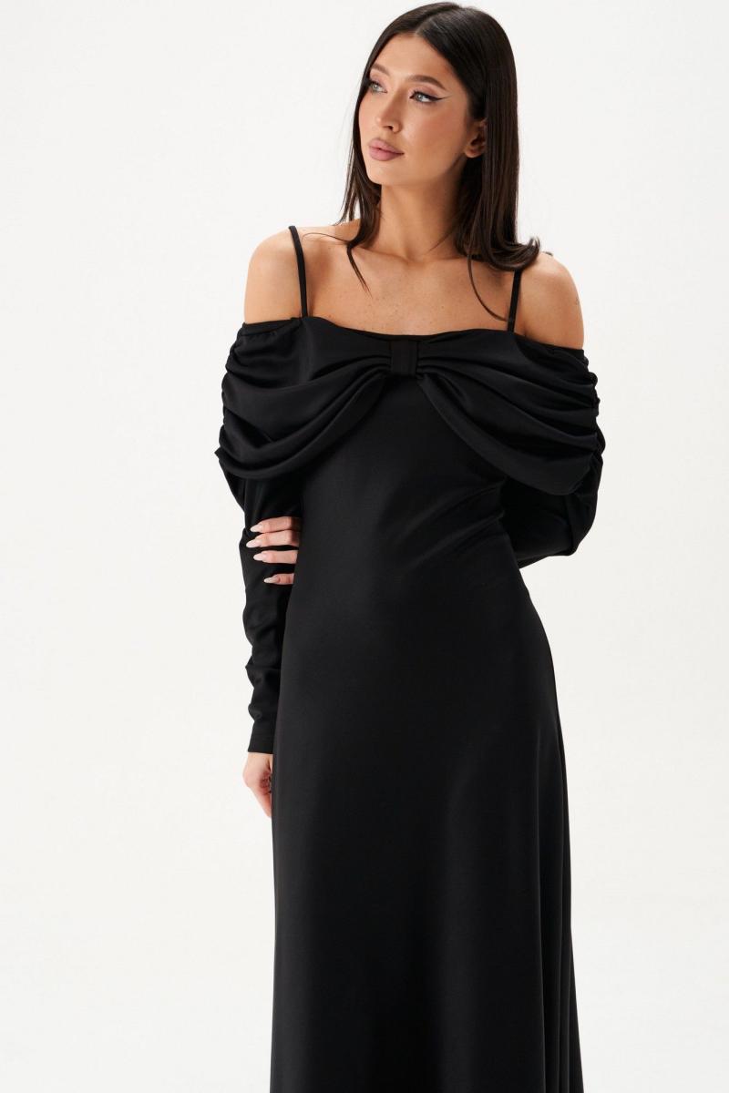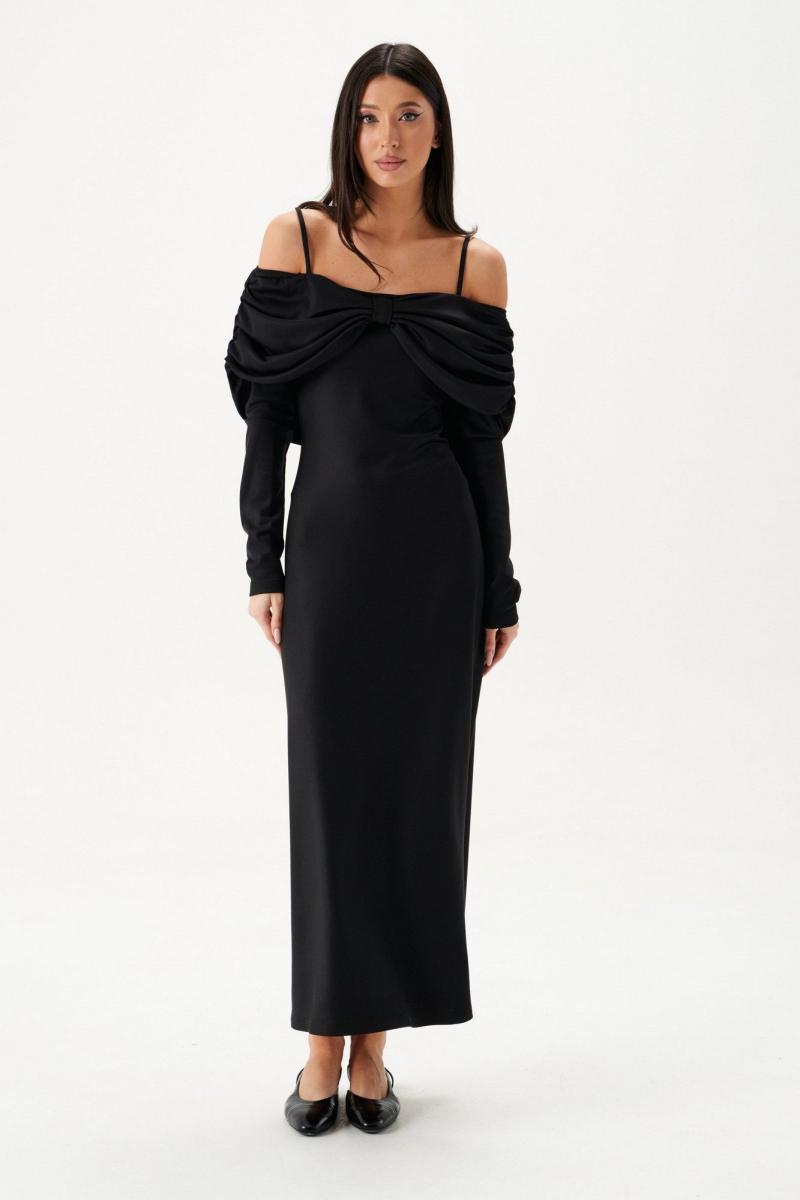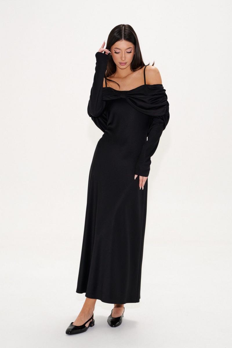 Платье-макси полуприлегающего силуэта. Выполнено из трикотажного полотна чёрного цвета. Вырез кармен. Декорирован широким воротником, переходящим на рукава и спинку, с декоративной сборкой. Бретели неругулируемые. По переду имитация банта. Длина спинки 120 см, длина рукава от линии воротника 61 см