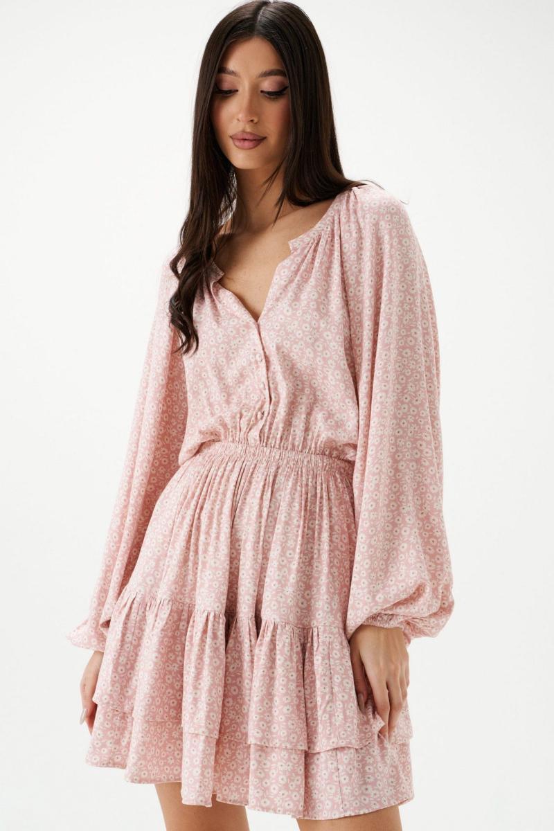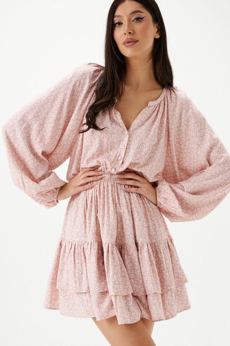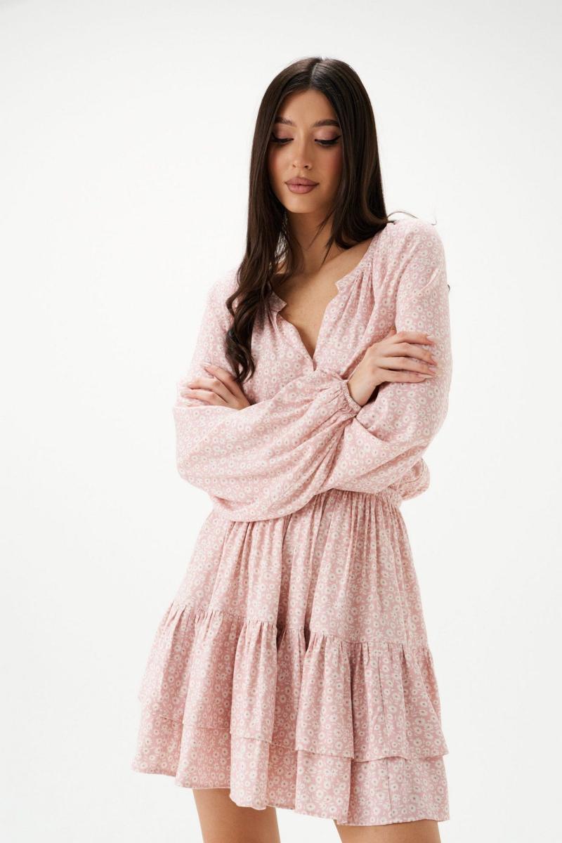 Платье полуприлегающего силуэта выполнено из розового полотна с белым цветочным принтом.Характеристики: полуприлегающий силуэт, подкладка, резинка по поясу, овальная горловина с разрезом, застежка центральная на петли пуговички, пуговички декорированы тканью основного изделия, рукав реглан, по низу рукава резинка, по низу изделия нашит двойной широкий волан. Длина по спинке 85 см, длина рукава 74 см.