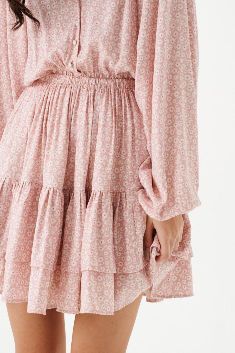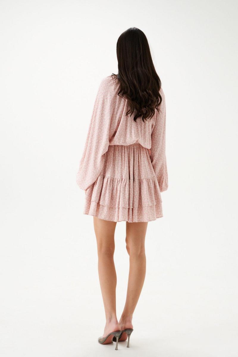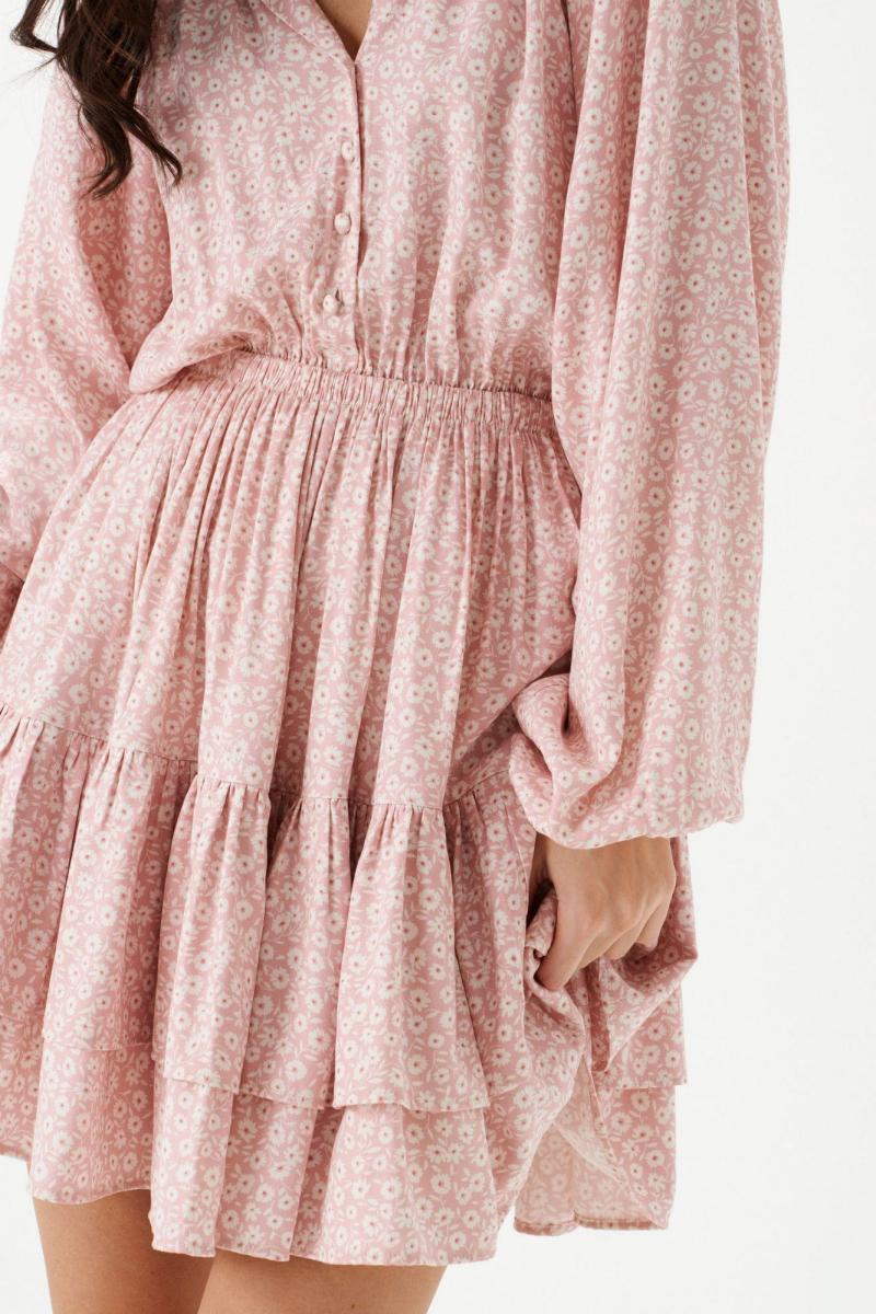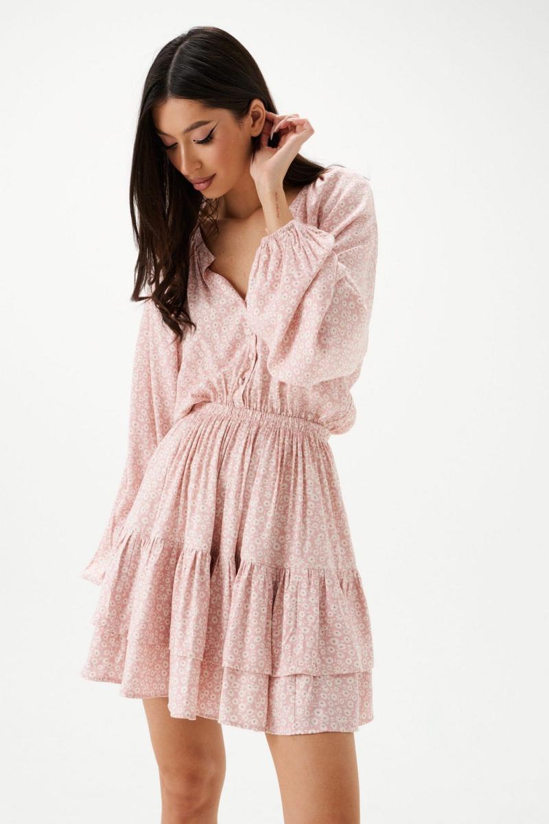 Платье полуприлегающего силуэта выполнено из розового полотна с белым цветочным принтом.Характеристики: полуприлегающий силуэт, подкладка, резинка по поясу, овальная горловина с разрезом, застежка центральная на петли пуговички, пуговички декорированы тканью основного изделия, рукав реглан, по низу рукава резинка, по низу изделия нашит двойной широкий волан. Длина по спинке 85 см, длина рукава 74 см.