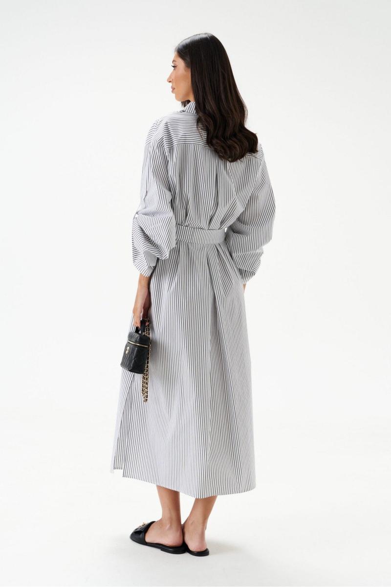 Платье свободного прямого кроя, . Характеристики: отложной воротник, застежка центральная на петли пуговицы, талия фиксируется поясом из основной ткани изделия, по переду нашиты функциаональные карманы. Рукав свободного кроя с пуговичкой по середине и скрытым элементом для удержания рукава при сборке. Спинка отрезная. Длина по спинке 130см.