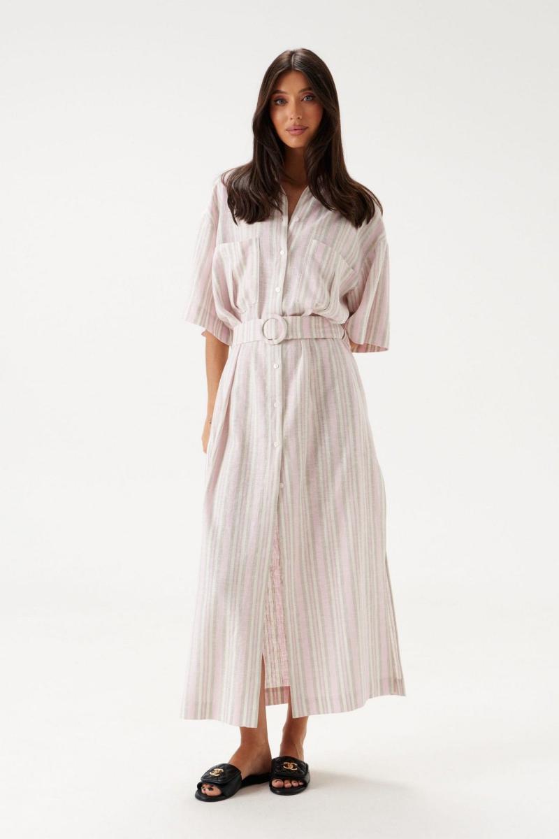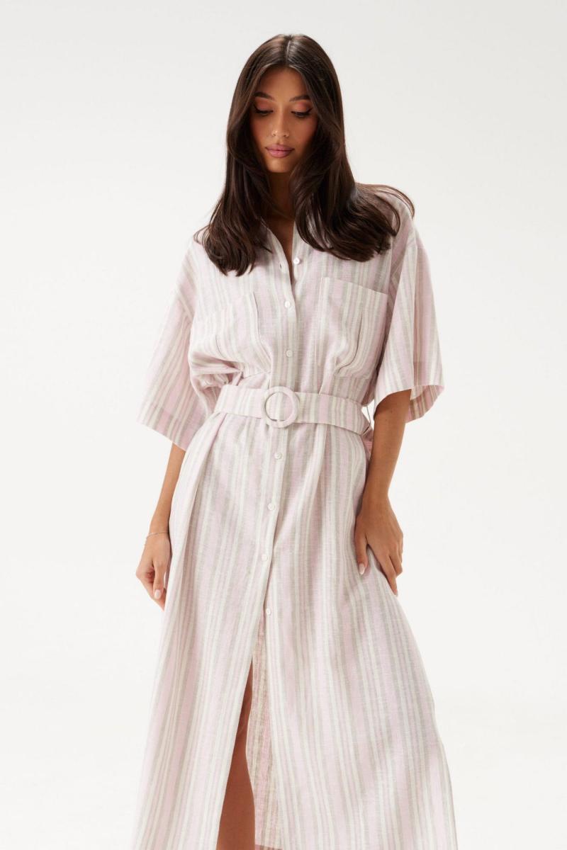 Платье прямого силуэта свободного кроя, выполнено из натурального полотна в вертикальную полоску. Рукав укорочен, спущен. По переду два функциональных кармана. Талия фиксируется поясом. Отложной воротник. Центральная застежка на петли - пуговицы. В боковых швах разрезы 55 см. Длина спинки 129 см, длина рукава от края горловины 45 см.