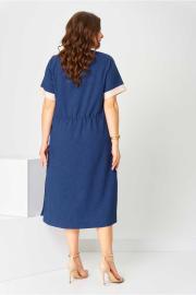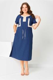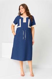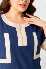 Платье женское летнее, свободного силуэта из плательной ткани двух цветов. Горловина округлая на планке, переходящей по центру с замочком. В области груди имитация кокеток с планочками. Платье отрезное по талии. По боковым швам разрезы. Спинка свободная . Рукава короткие на манжетах.