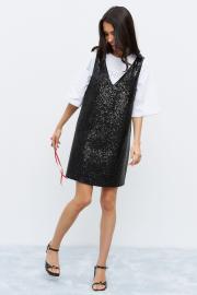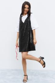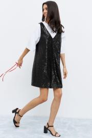 Платье в длине мини, с v-образным вырезом. Платье из ткани в черные пайетки