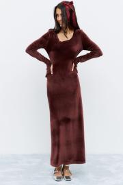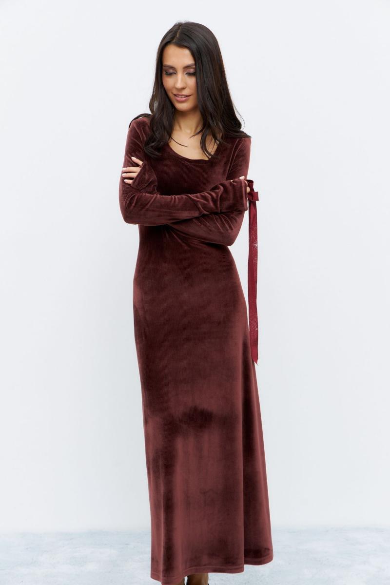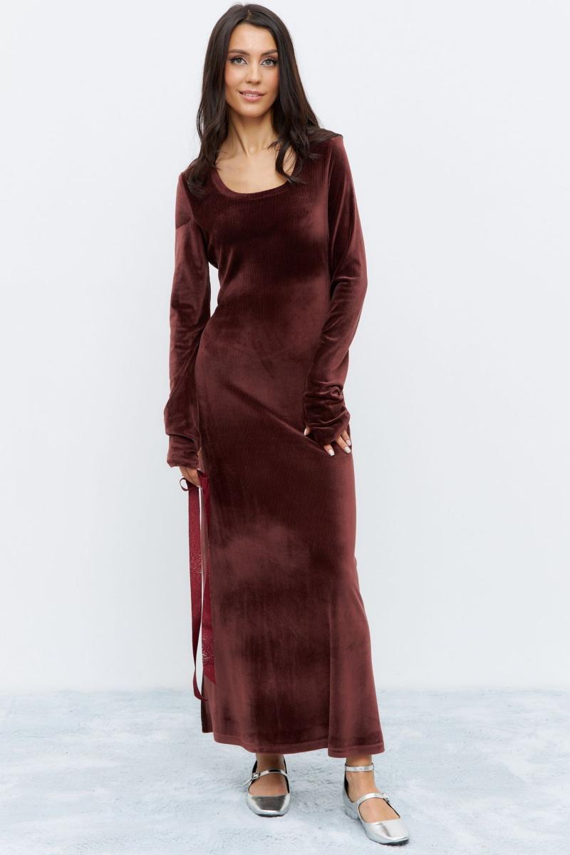 Платье в длине миди, приталенного силуэта. Выполнено из ткани с эффектом бархата, в глубоком бордовом цвете. Рукав удлиненный.