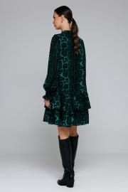 Платье А-силуэта. С втачным рукавом на резинках внизу. Полочка и спинка с притачными воланами по низу. Платье на подкладке. Воротник-стойка переходящий в завязку спереди. Горловина округлая с вырезом-каплей по переду.