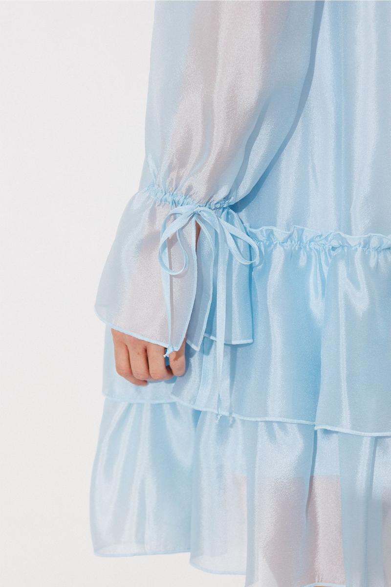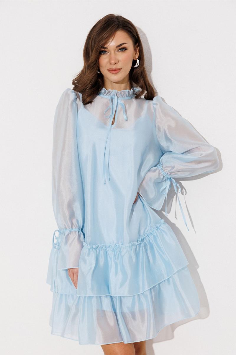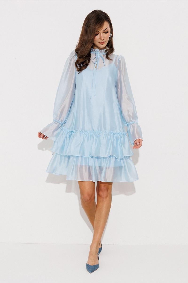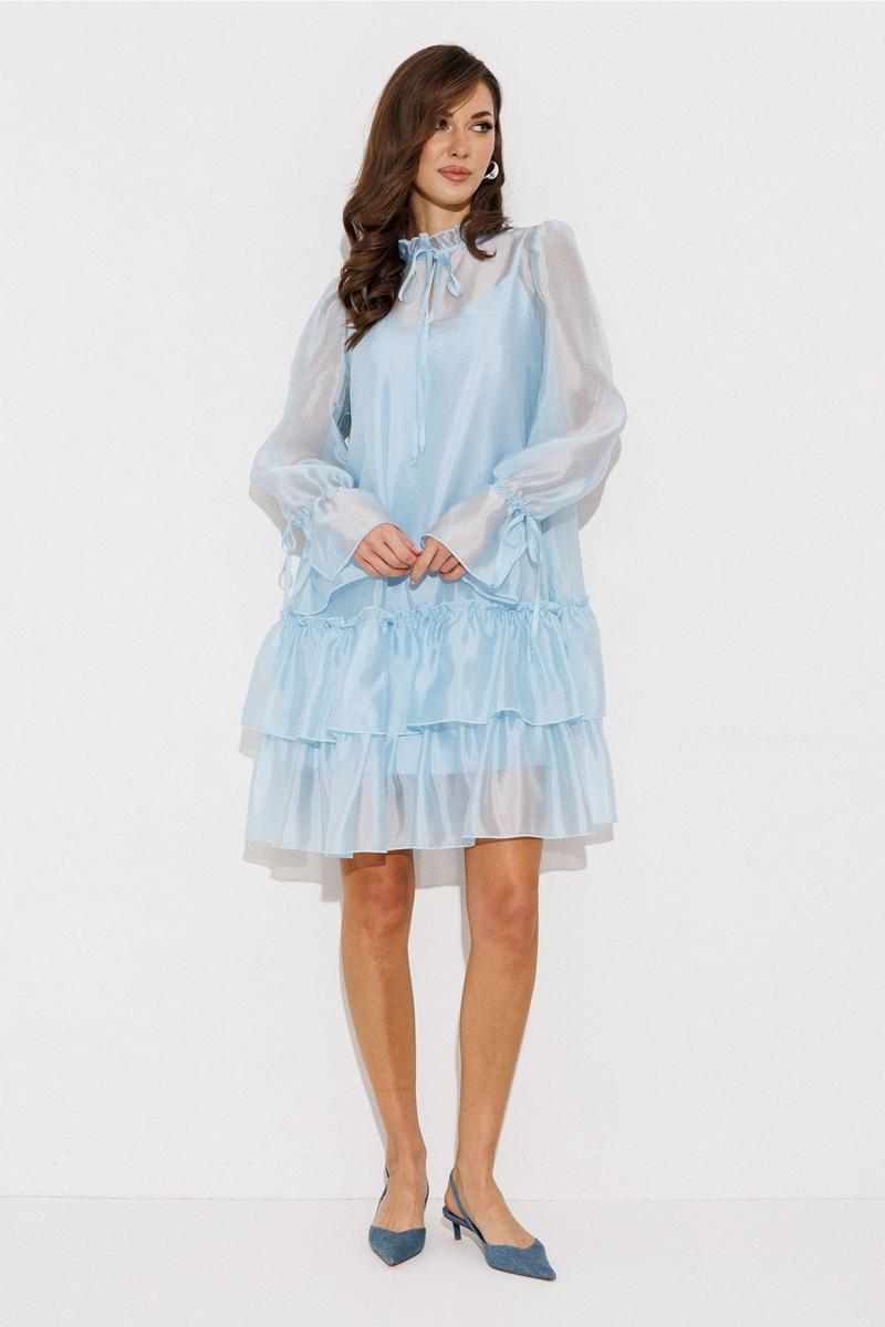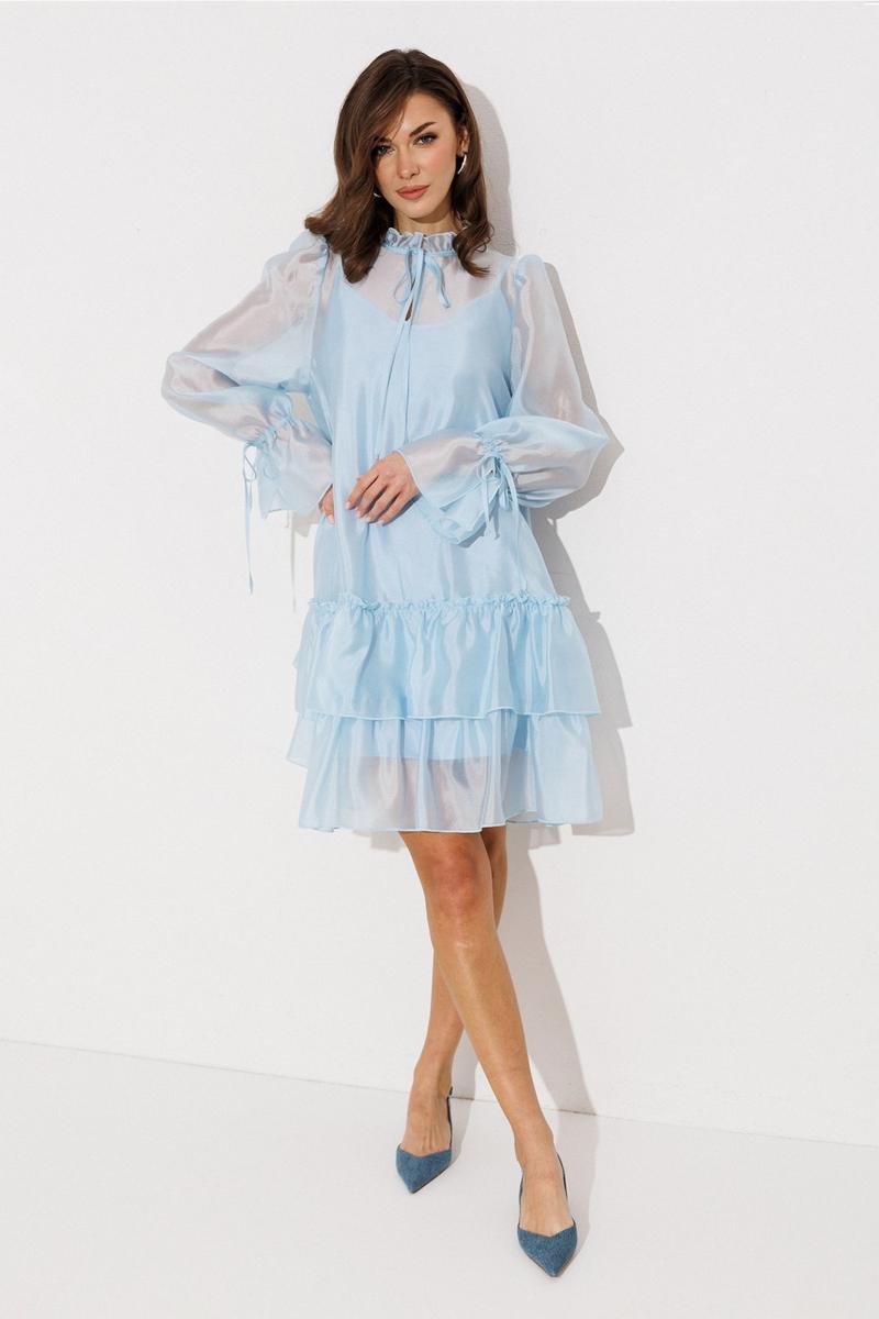 Платье А-силуэта, состоящее из 2-х слоев. Верхний слой: втачной длинный рукав со сборкой по окату и внизу на завязке, полочка и спинка с притачными слегка присборенным воланом с рюшей, воротник стойка-рюша и вырезом каплей по переду на завязке. Нижний слой: платье на бретелях с вытачками по переду на груди.