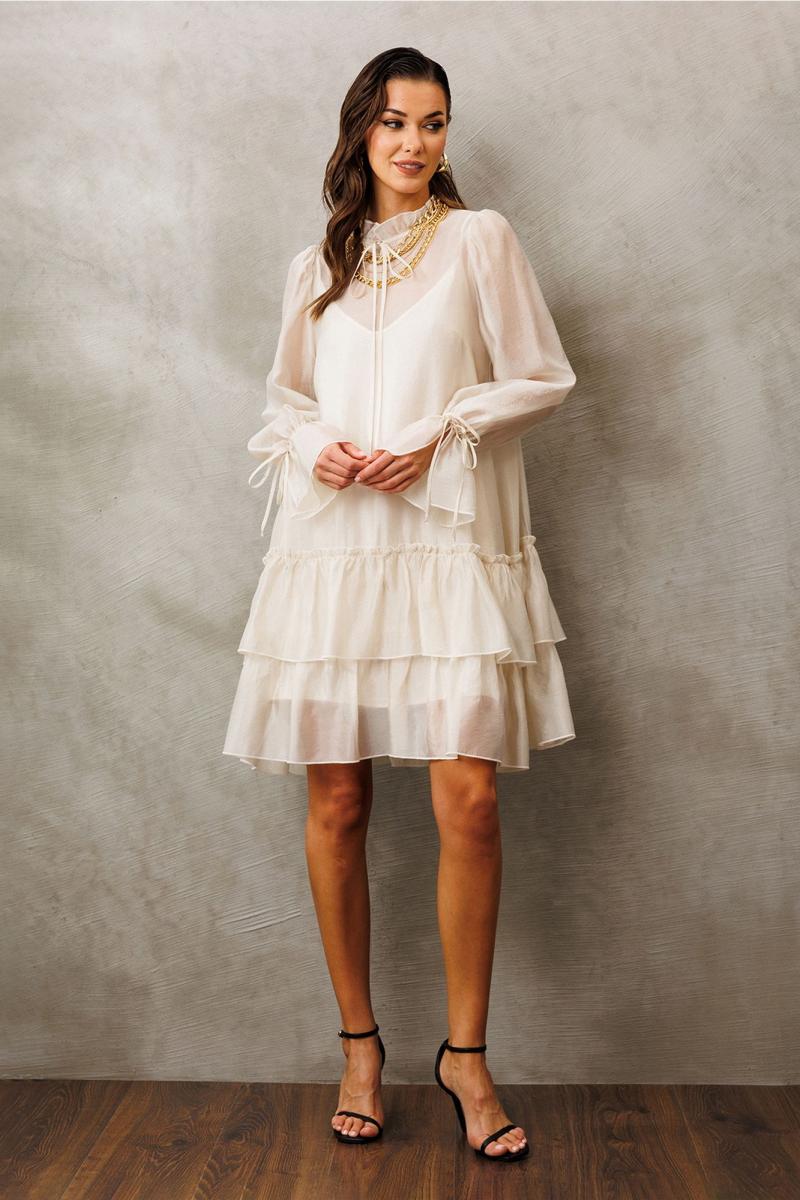 Платье из креп-шифона с напылением А-силуэта, состоящее из 2-х слоев. Верхний слой: Втачной длинный рукав со сборкой по окату и внизу на завязке, полочка и спинка с притачными слегка присборенным воланом с рюшей,в оротник стойка-рюша и вырезом каплей по переду на завязке. Нижний слой: платье на бретелях