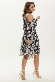 Стильное платье из струящейся ткани с оригинальным принтом полуприлегающего силуэта длины миди. По переду от талии по лифу заложены складки. Отрезной лиф, по линии талии эластичная тесьма. Горловина лодочка, по среднему шву спинки от горловины молния. Рукав втачной длинный, по низу рукава манжета с эластичной тесьмой. В правом рукаве в верхней части фигурный вырез. Низ ассиметричный. Платье на трикотажной подкладке.