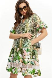 Платье А-образного силуэта с воланом по низу, волан декорирован кружевом. Горловина V-образная с отложным воротником. По переду прорезные карманы с листочкой. Рукав втачной короткий, по низу рукава волан декорирован кружевом.