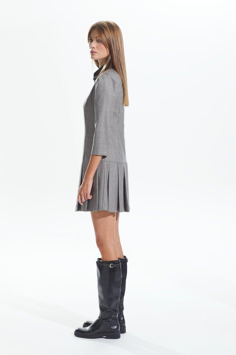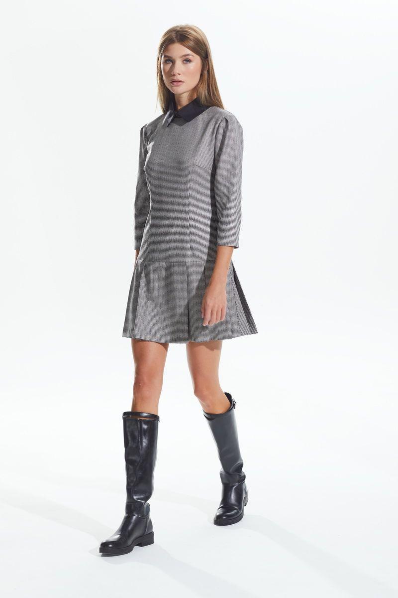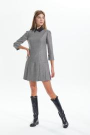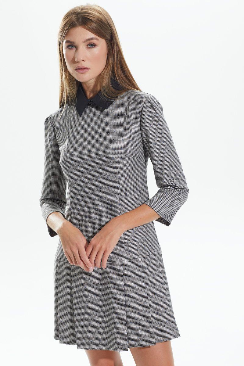 Платье женское полуприлегающего силуэта со съемным воротником и декором в виде броши . Выполнено из плательно-костюмной ткани высокого качества . Рукав втачной одношовный с разрезом внизу . По линии бедер подрез , нижняя часть платья со складками . Платье на шелковичной отлетной подкладке . Застежка - потайная молния по спинке .