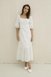 Платье женское приталенного силуэта выполнено из хлопкового ришелье . Платье на подкладке из 100 % хлопка . Вырез горловины "каре", рукав втачной одношовный , со сборкой по окату , низ рукава присборен на эластичную ленту. Внизу платье притачен волан , по спинке завязки из однотона . Застежка в виде потайной молнии в боковом шве .