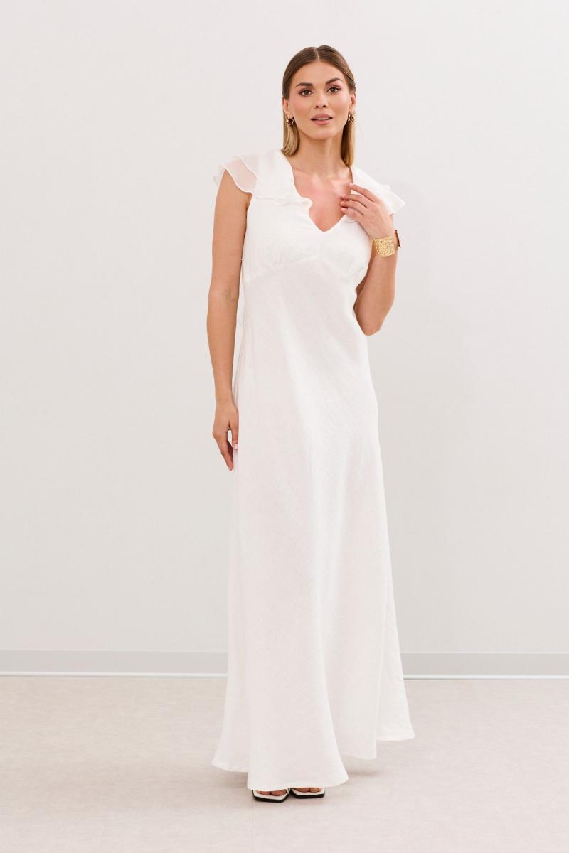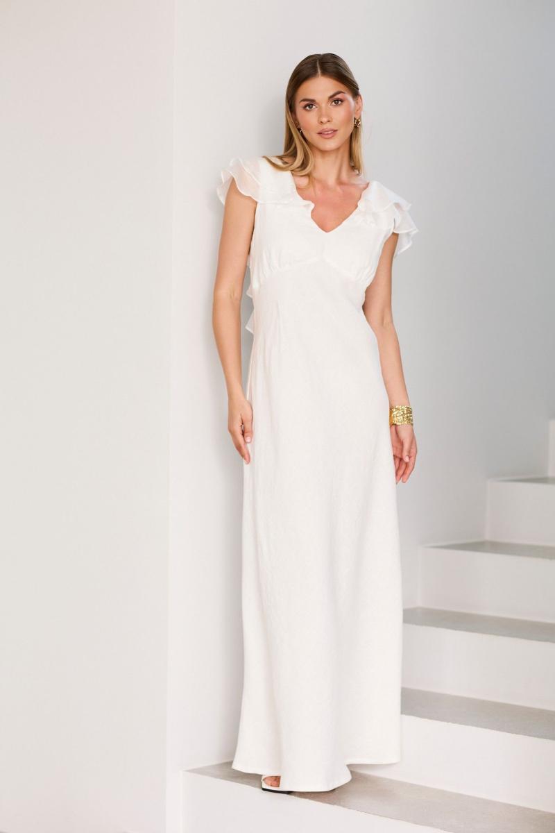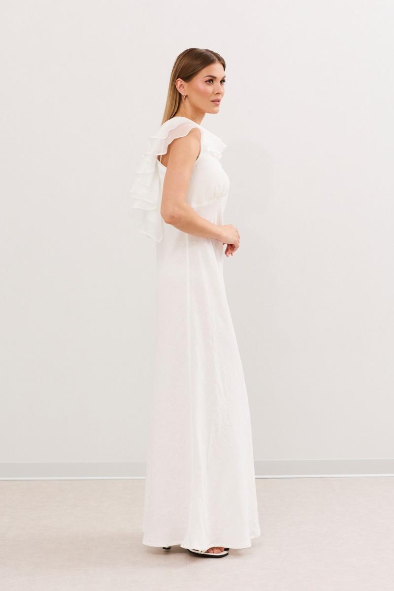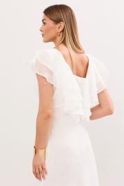 Платье женское полуприлегающего силуэта, отрезное под грудью. Нижняя часть платья раскроена по косой, что очень стройнит фигуру. Акцентом данного платья являются воланы из вуали, которые переходят на спику и декорируют ее.