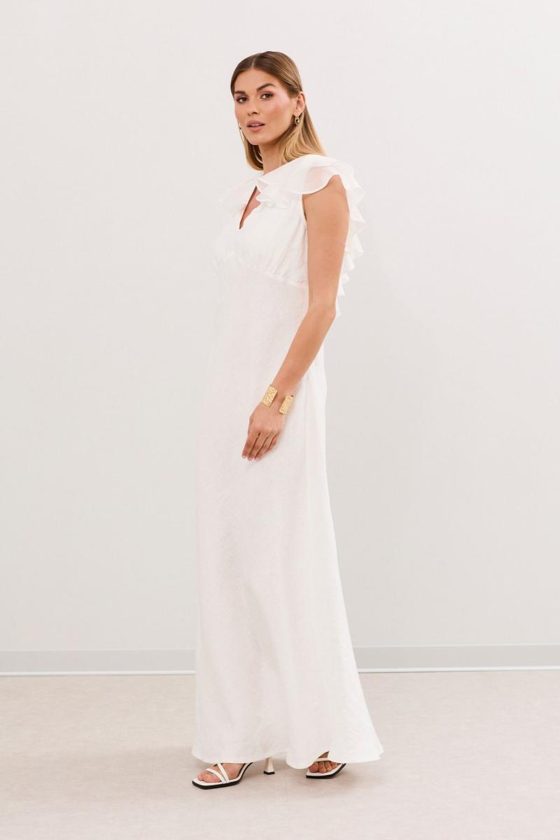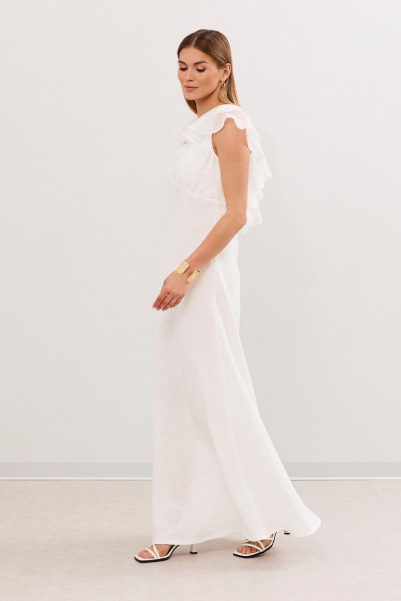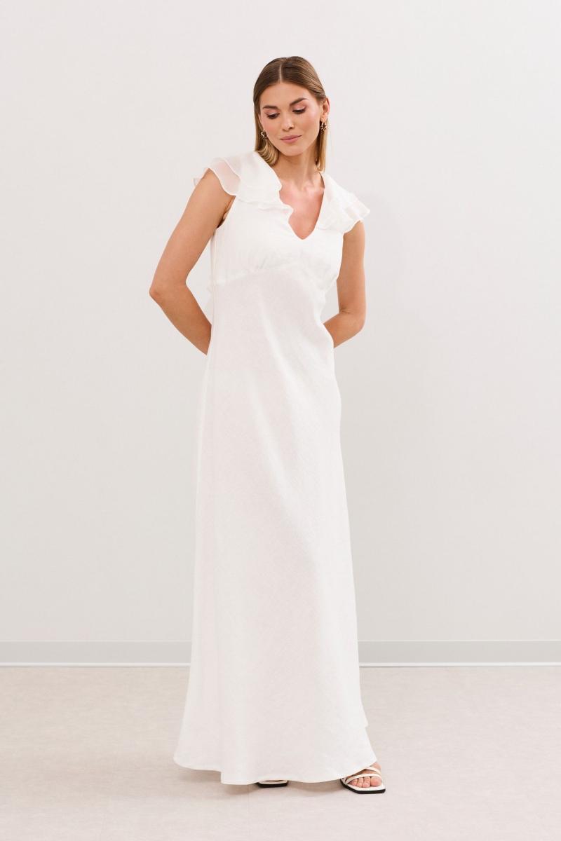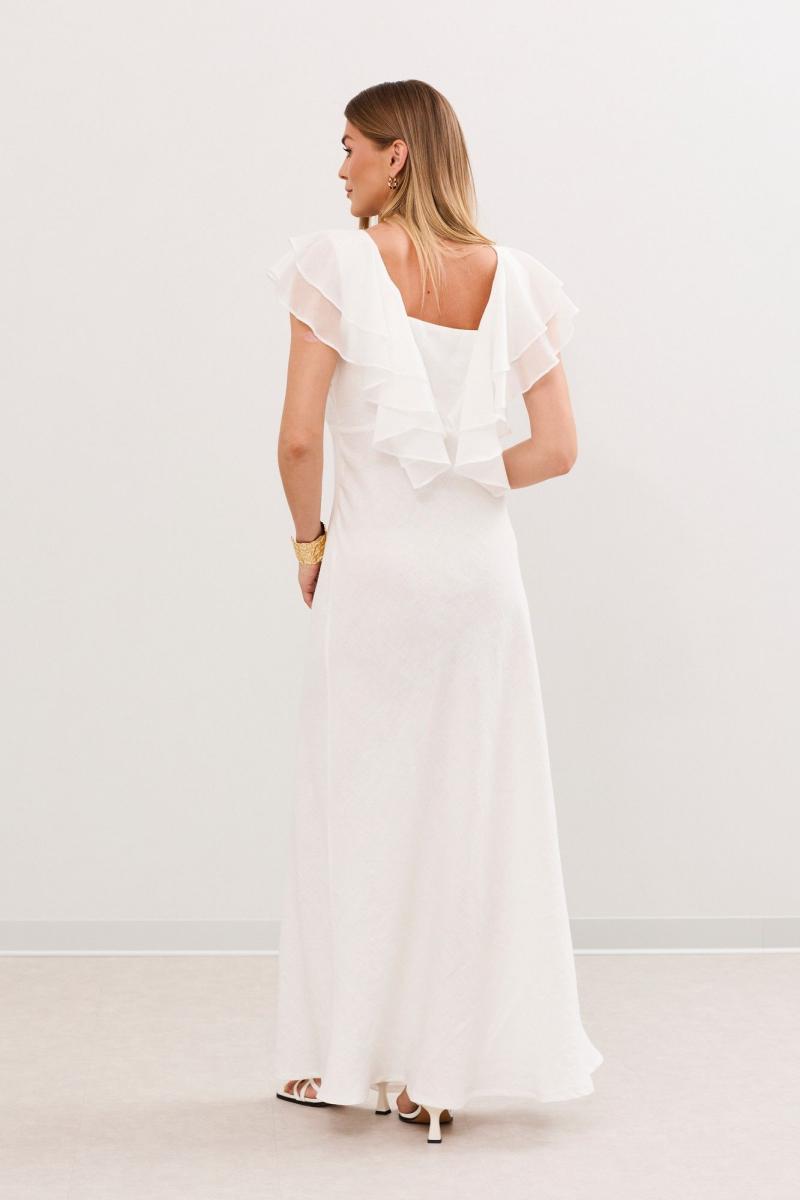 Платье женское полуприлегающего силуэта, отрезное под грудью. Нижняя часть платья раскроена по косой, что очень стройнит фигуру. Акцентом данного платья являются воланы из вуали, которые переходят на спику и декорируют ее.