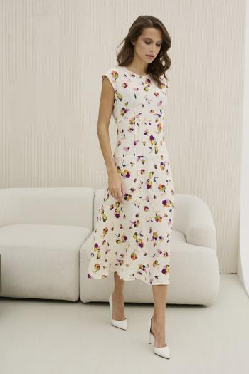 Платье из лёгкой вискозной ткани платьево-блузочного ассортимента, А-силуэта, длиной выше щиколотки, с рукавами-крылышки. Горловина переда и спинки V-образной формы. Перед разрезной по центру, с двумя накладными прямоугольными карманами, на уровне бёдер. По боковым и нижнему краям карманов, рюш из основной ткани. Спинка без особенностей. Дополнительное расширение силуэта, за счёт клиньев по боковым швам, от уровня талии до низа. Платье без подкладки.