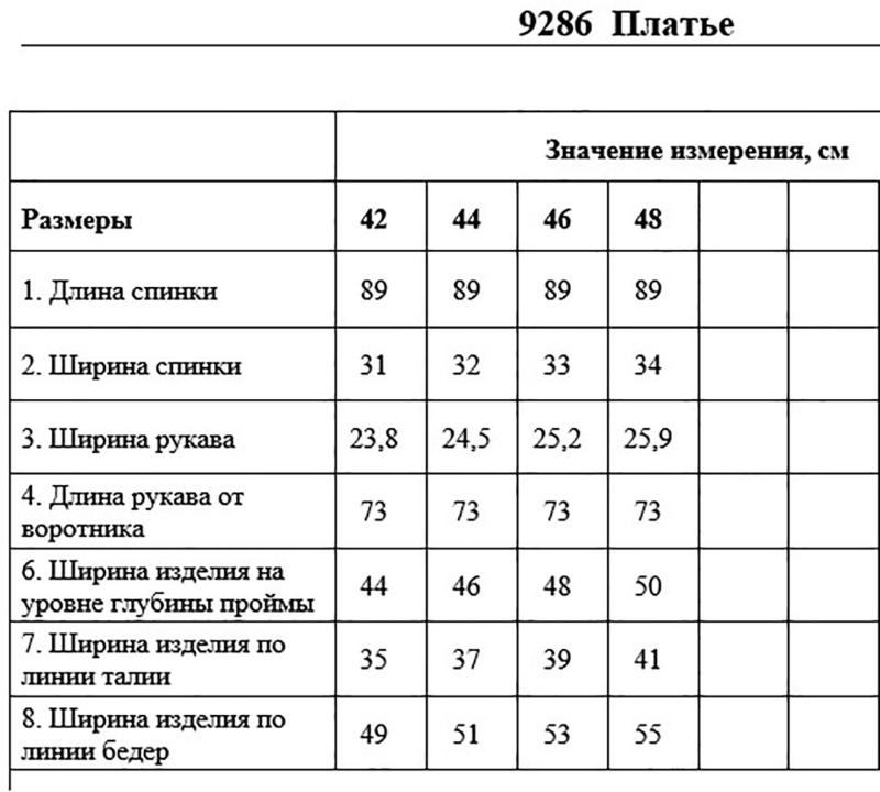 Платье, из ткани костюмно-плательного ассортимента, в сочетании с матовой органзой, отрезное по линии талии. Платье длиной выше линии колена, с втачными рукавами длиной до запястья, с «американской» линией проймы, со стояче-отложным воротником с вытянутыми концами. Застёжка платья однобортная на петли и пуговицы. Лиф прилегающего силуэта, передние половинки с талиевыми вытачками и рельефами. Спинка со средним швом и талиевыми вытачками. Нижняя часть платья слегка расширена. Рукава «буфы», из прозрачной органзы, со сборкой в верхней части оката и по шву притачивания манжет. Застёжка манжет на петлю и пуговицу. Платье на подкладке.
