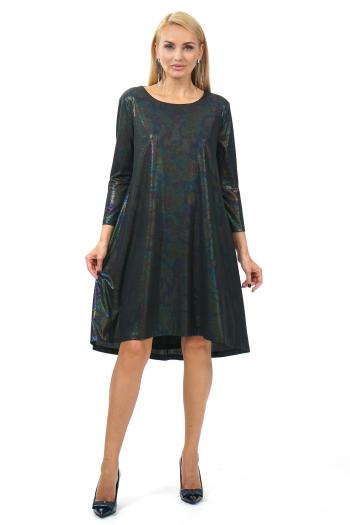 Платье выполнено из однотонной костюмно-плательной ткани. Платье женское, приталенного силуэта, длиной ниже линии колена. Спереди в среднем шве разрез. Застежка в среднем шве спинки на потайную молнию. Горловина округлой формы. Рукав покроя реглан с плечевой вытачкой, короткий. Рукав выполнен из отделочной ткани с вышивкой пайетками.