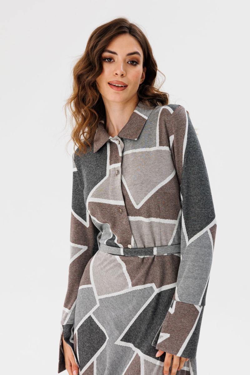 Платье выполнено из трикотажного полотна с геометрическим принтом. Платье Х-образного силуэта, отрезное по линии талии, длиной миди. Застежка спереди на пуговицы на планке. Воротник стояче-отложной. Рукав втачной, одношовный. Низ рукава на широкой притачной манжете с разрезом. Юбка расширена к низу. В боковом шве застежка на потайную молнию. В комплект входит обтяжной ремень.