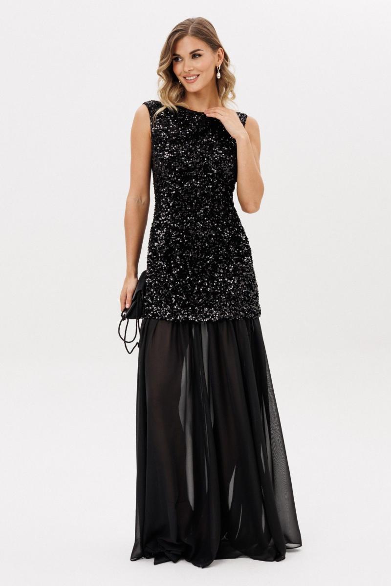 Платье выполнено из барахата с пайетками. Платье Х-образного силуэта, длиной в пол. Верх платья выполнен в виде приталенного платья длиной ниже линии бедер. Застежка на молнию с металлическими звеньями сзади в среднем шве спинки. Плечевой шов заужен. Горловина формы "лодочка". Нижняя часть платья выполнена из шифона и состоит из 8 клиньев. Верх платья на притачной по низу подкладке. Длина платья: 151 см. 44 46 48 Длина по центру спинки 151 151 151 Длина рукава Объем по груди 90 94 98 Объем по талии 74 78 82 Объем по бедрам 100 104 108 Объем по низу 102 106 110