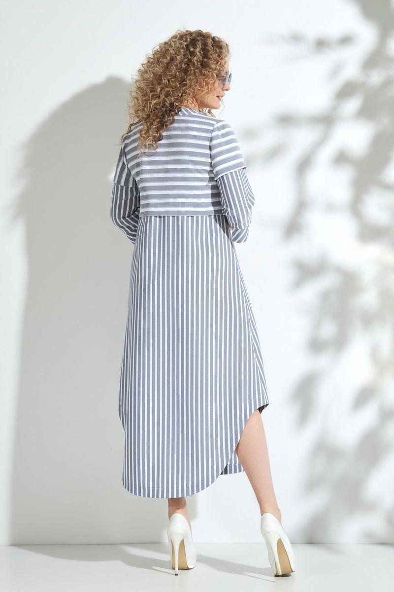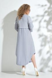 Платье – рубашка, выполнено из сочетания однотекстурных тканей- компаньонов. Горловина- округлая. Рукав втачной, низ рукава обработан декоративной манжетой. По переду расположены прорезные карманы- рамки. Низ- фигурный. длина изделия по центральному шву спинки 124. Длина рукава 42. Длина изделия по боковому шву до выреза (разреза) 75