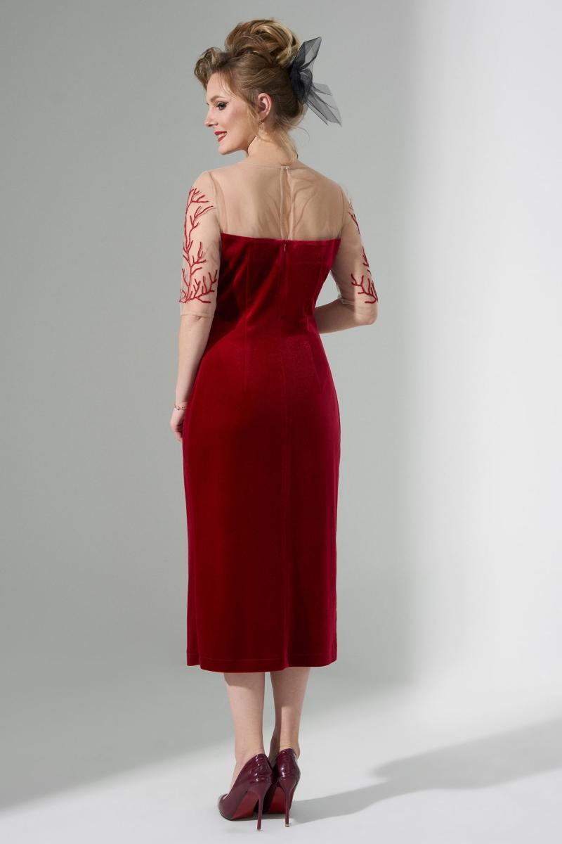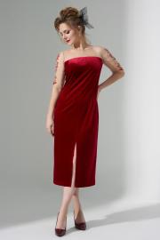 Платье женское выполнено из велюра и прозрачной сетки. Изделие прилегающего силуэта. По горловине выполнен вырез со вставкой из сетки . На сетке по рукавам - вышивка. Рукав втачной длинный, зауженный к низу. По низу изделия длинный разрез 40см.