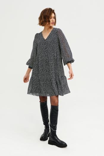 Платье женское выполнено из плательной ткани с полупрозрачными вставками из сетки. Изделие прямого кроя, по переду изделия расположен накладной карман. Горловина округлая. Рукав втачной-короткий.